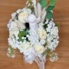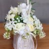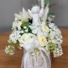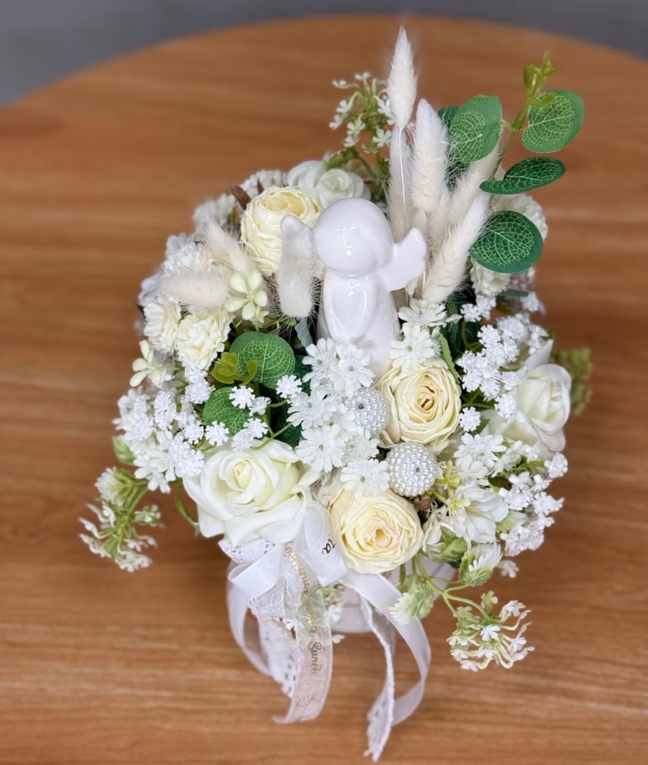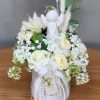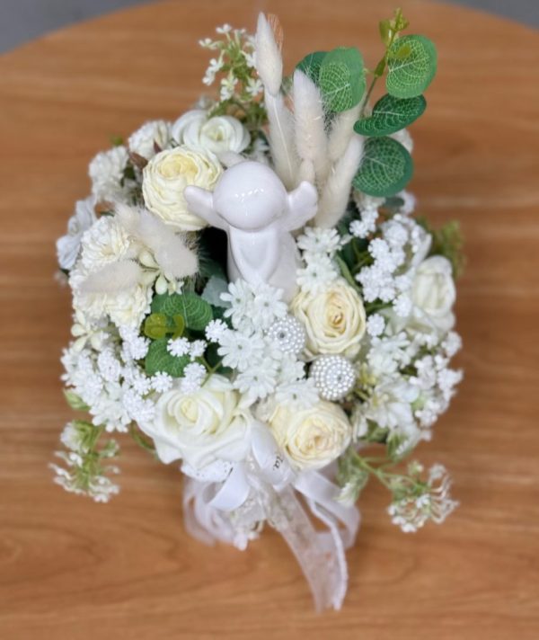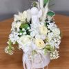 Kompozycja wykonana w całości ze sztucznych kwiatów i dodatków.