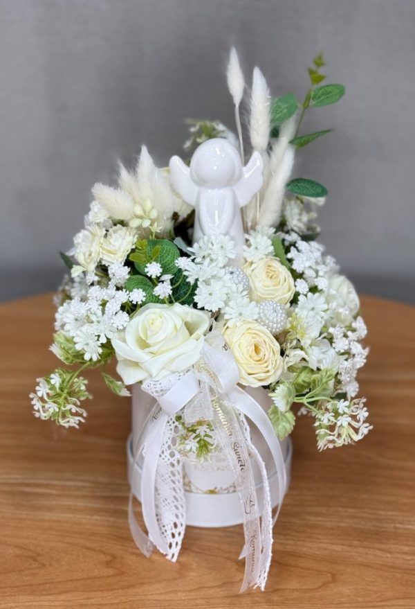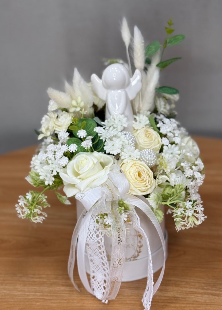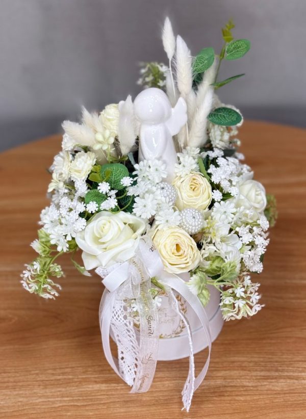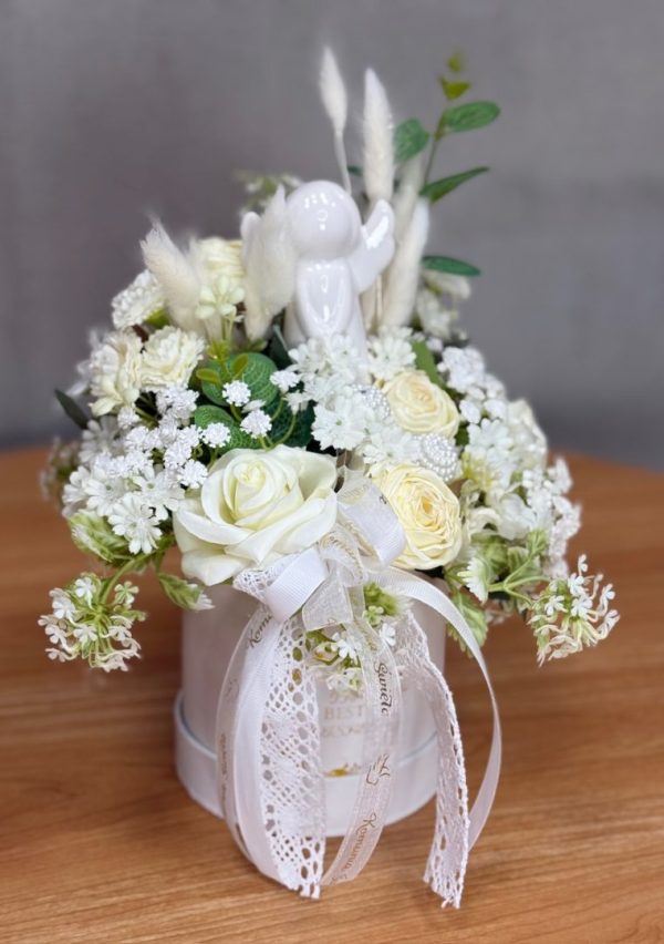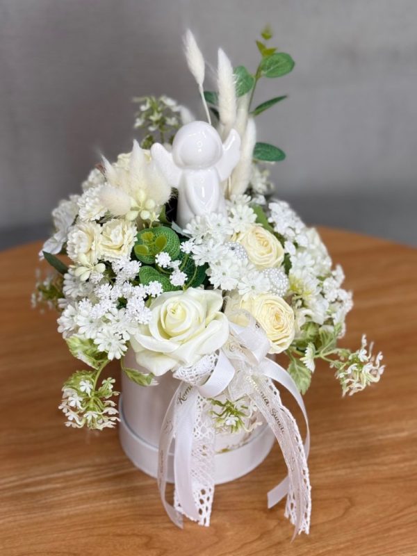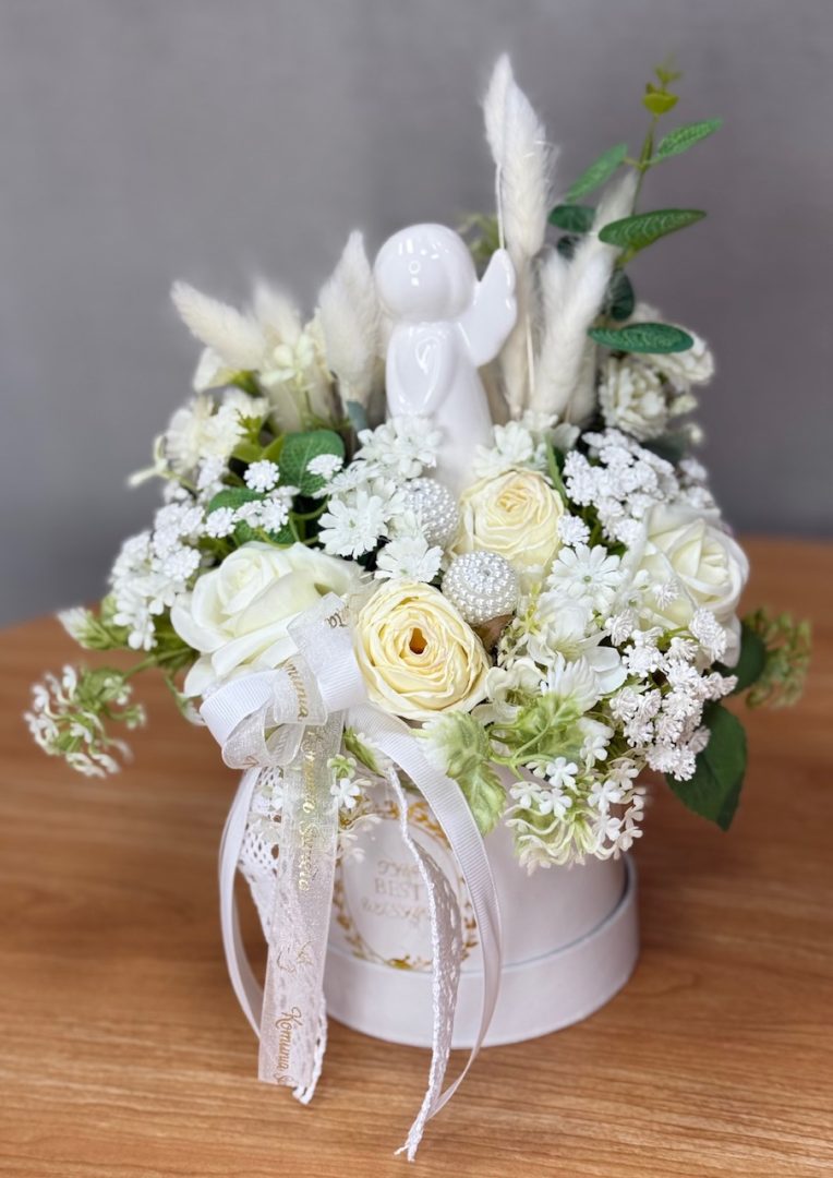 Dekoracja wykonana jest w ozdobnym pudełku na kwiaty.