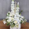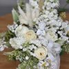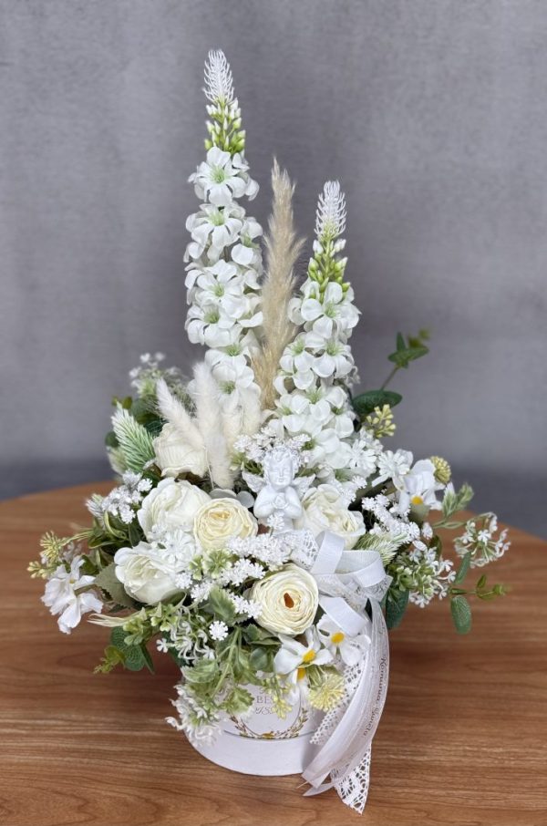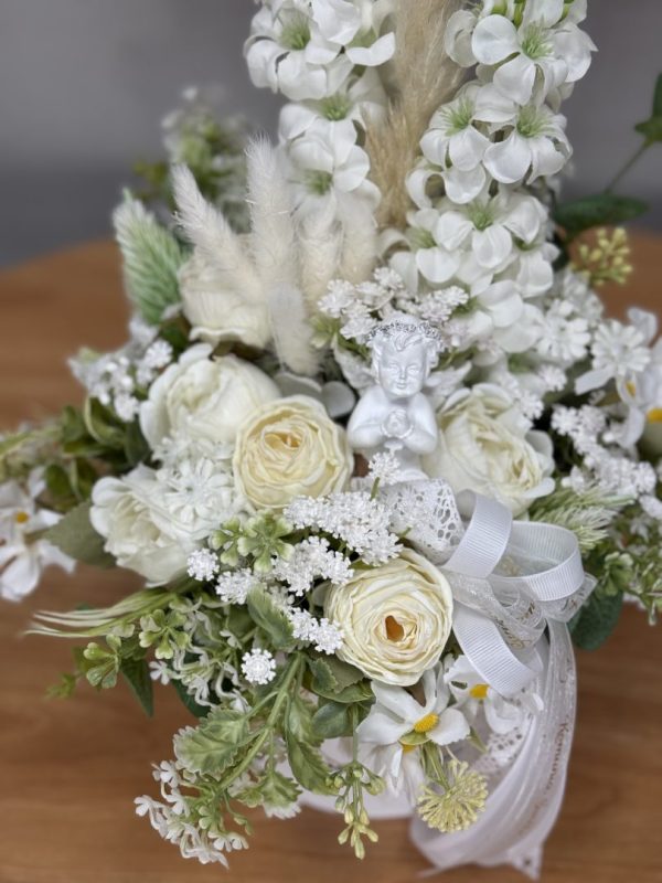 Kompozycja wykonana w całości ze sztucznych kwiatów i dodatków.
