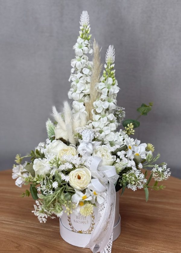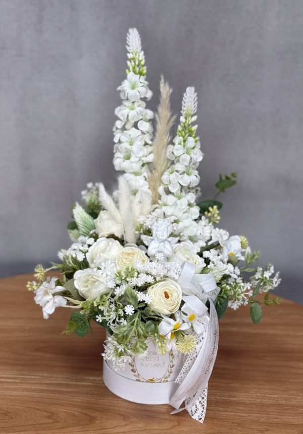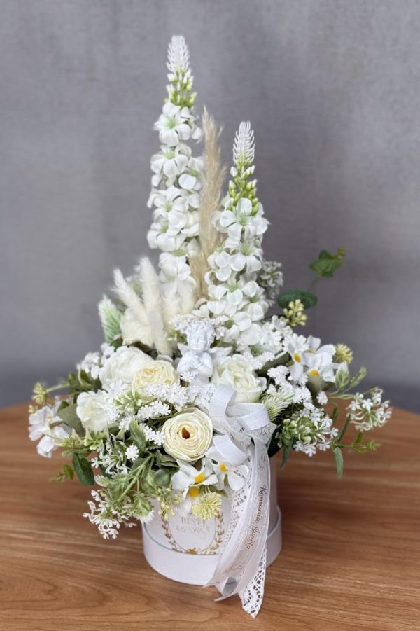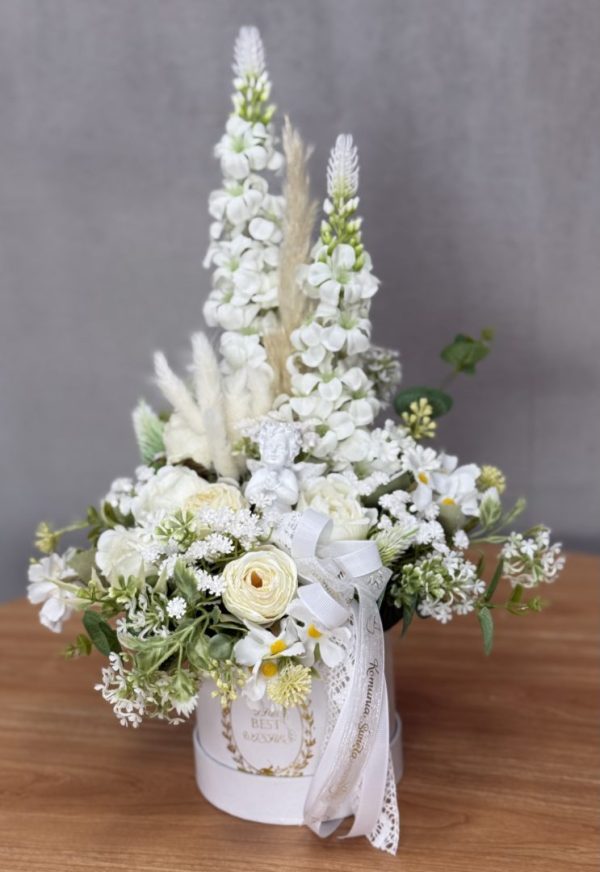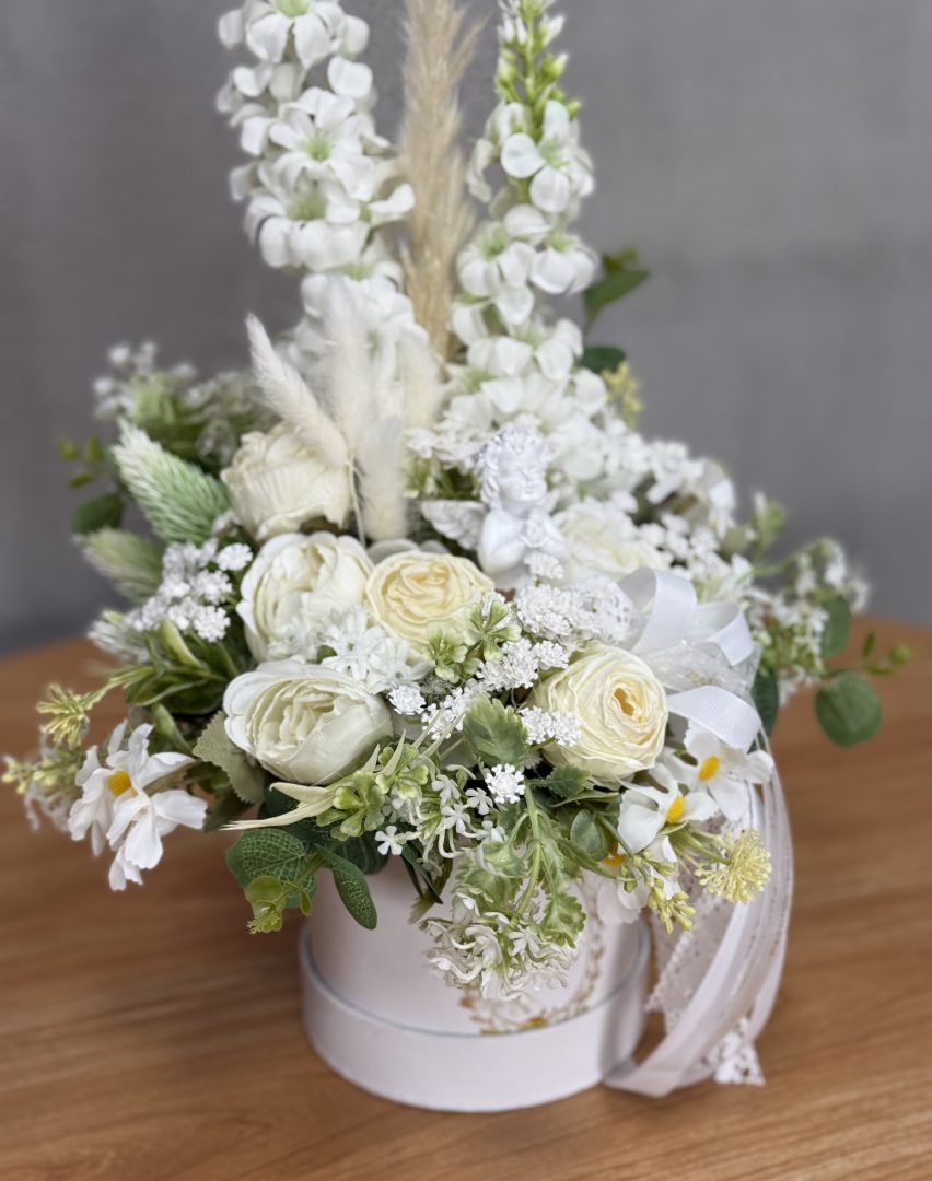 Dekoracja wykonana jest w ozdobnym pudełku na kwiaty.