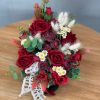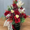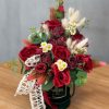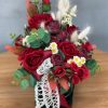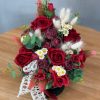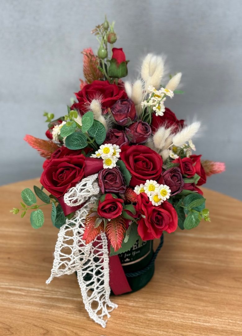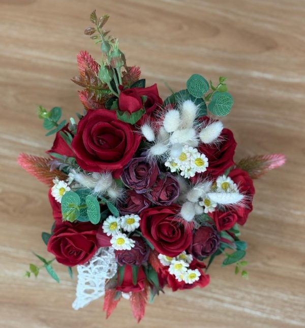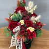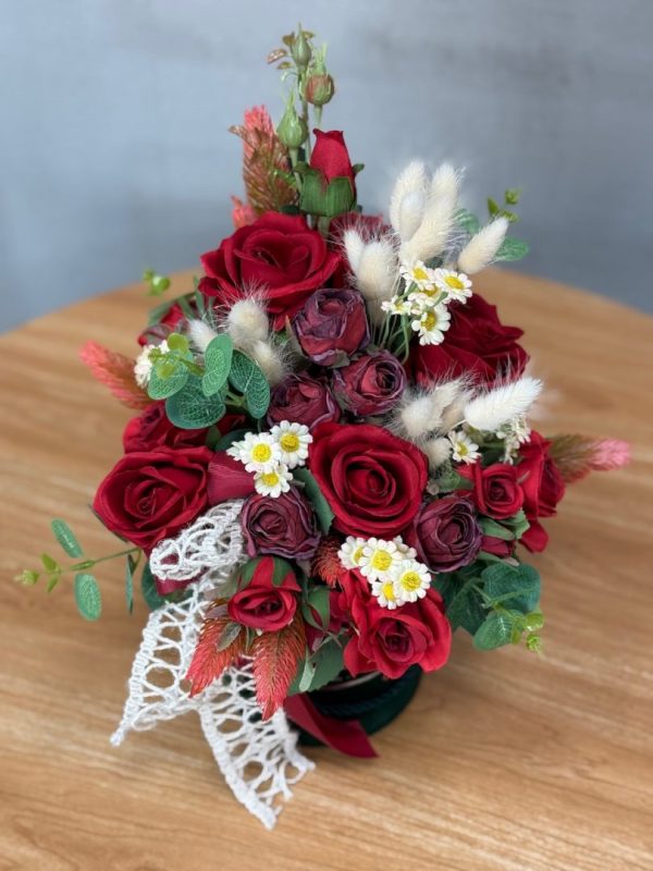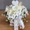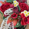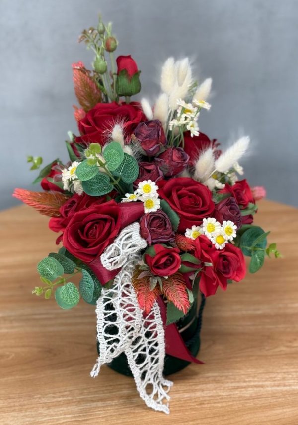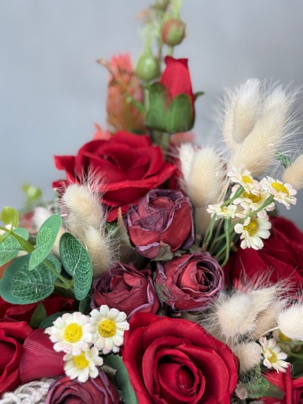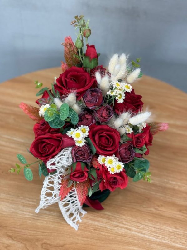 Kompozycja wykonana w całości ze sztucznych kwiatów i dodatków.