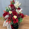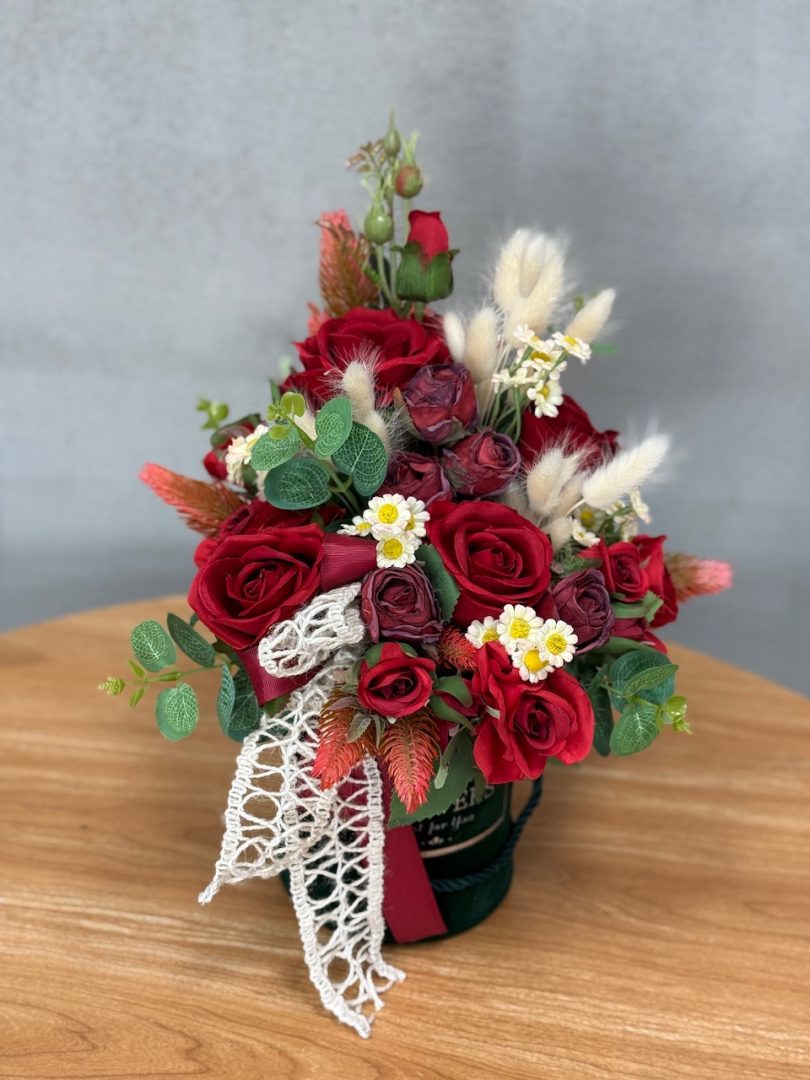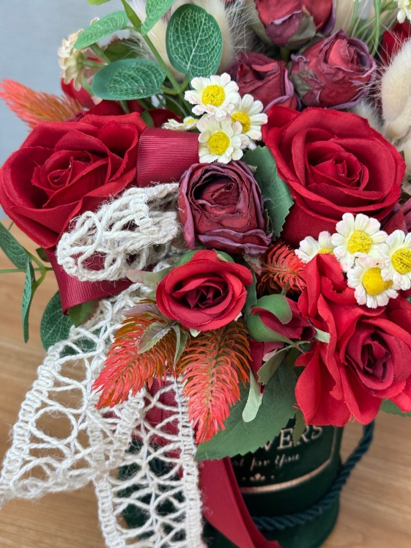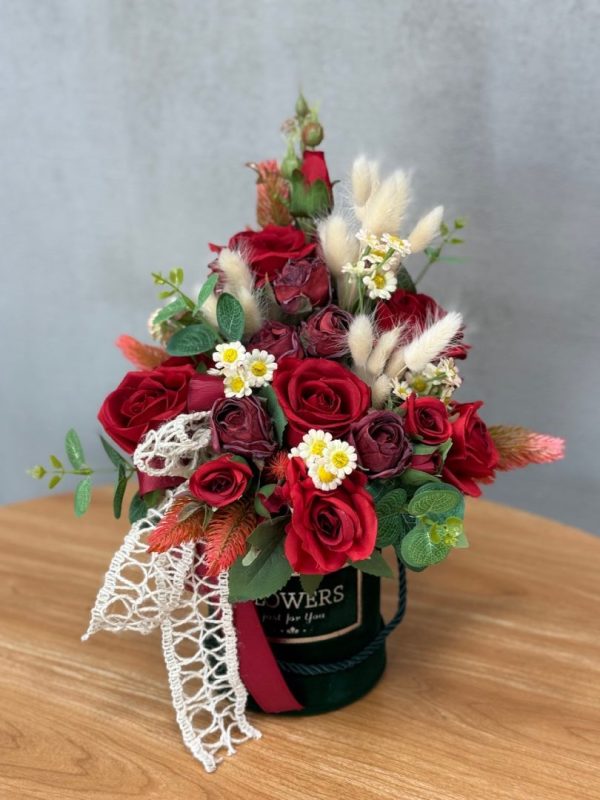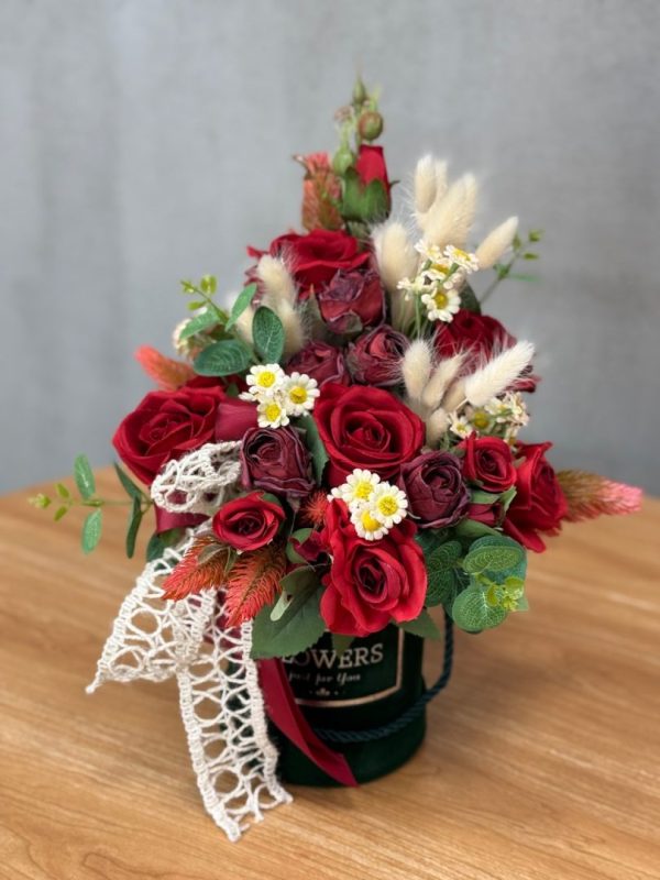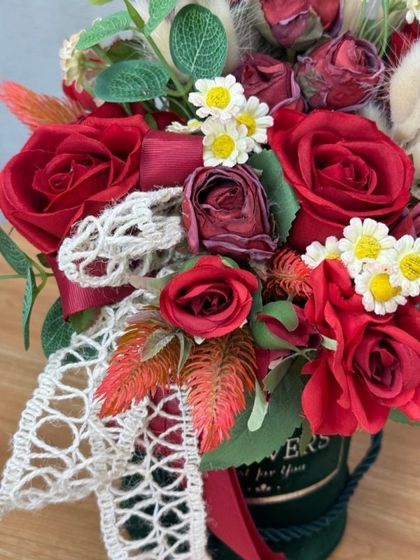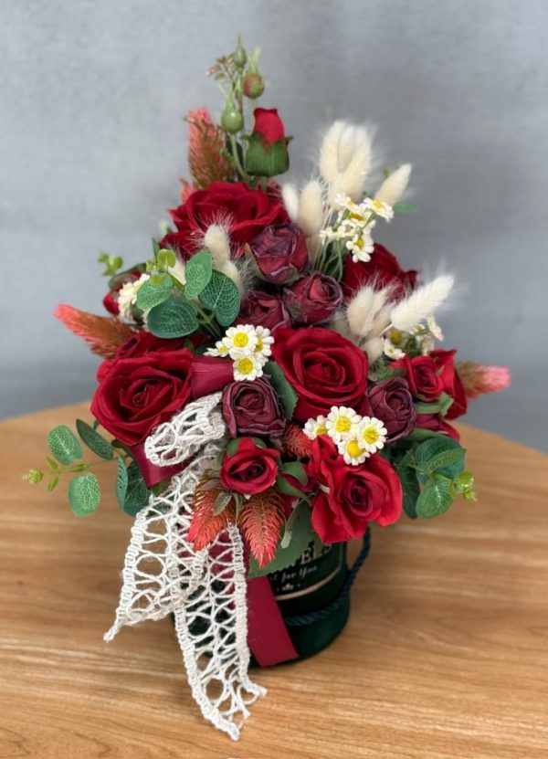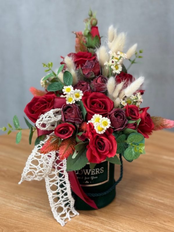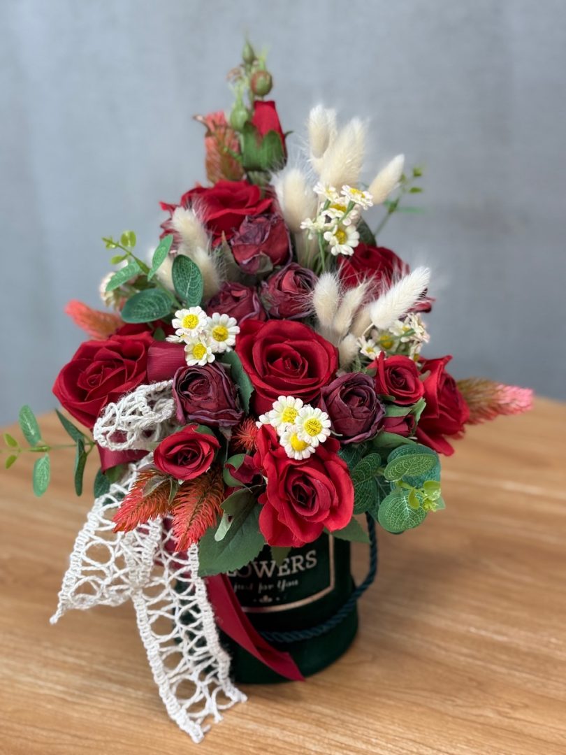 Dekoracja wykonana jest w ozdobnym pudełku na kwiaty.