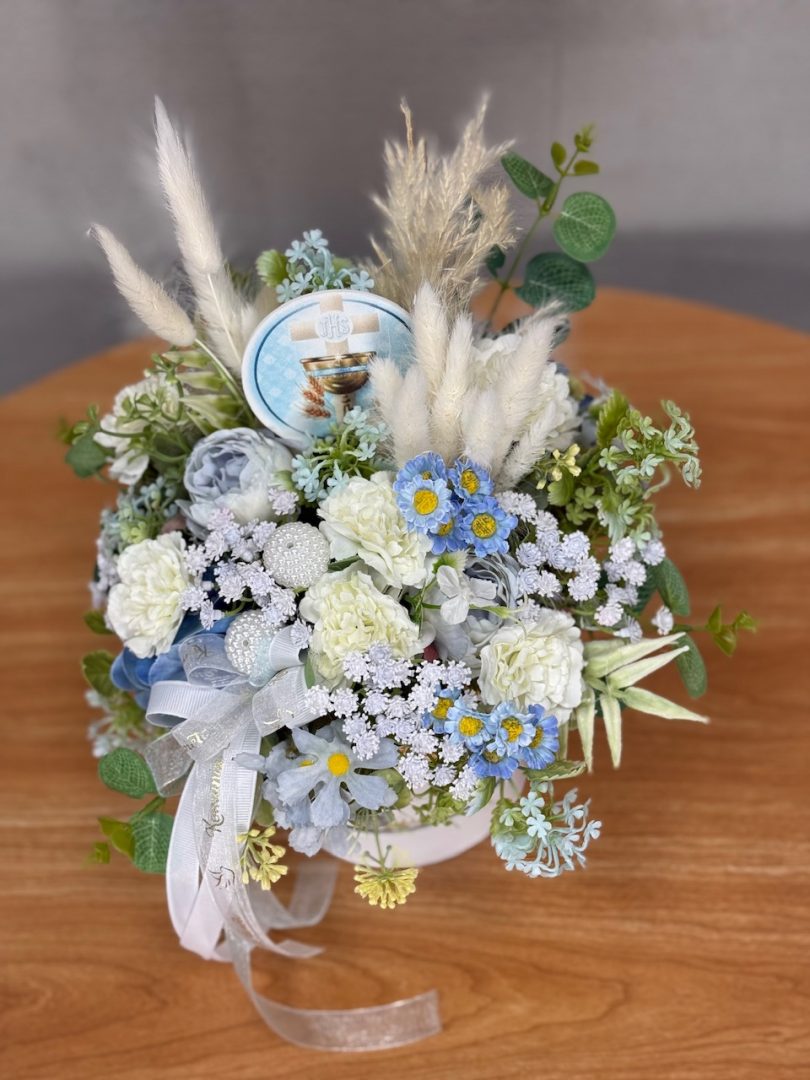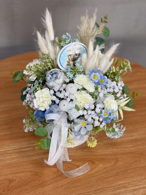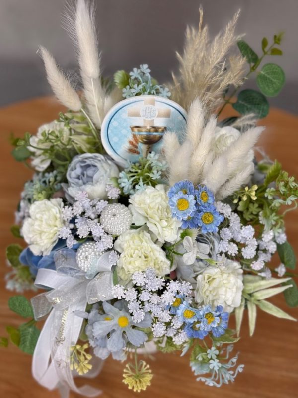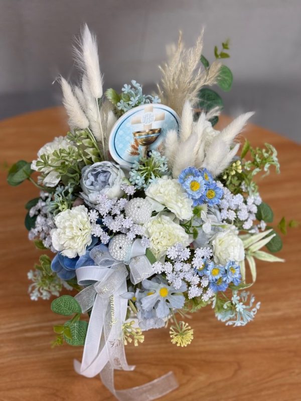 Kompozycja wykonana w całości ze sztucznych kwiatów i dodatków.