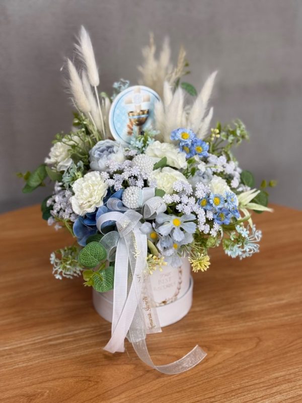 Dekoracja wykonana jest w ozdobnym pudełku na kwiaty.