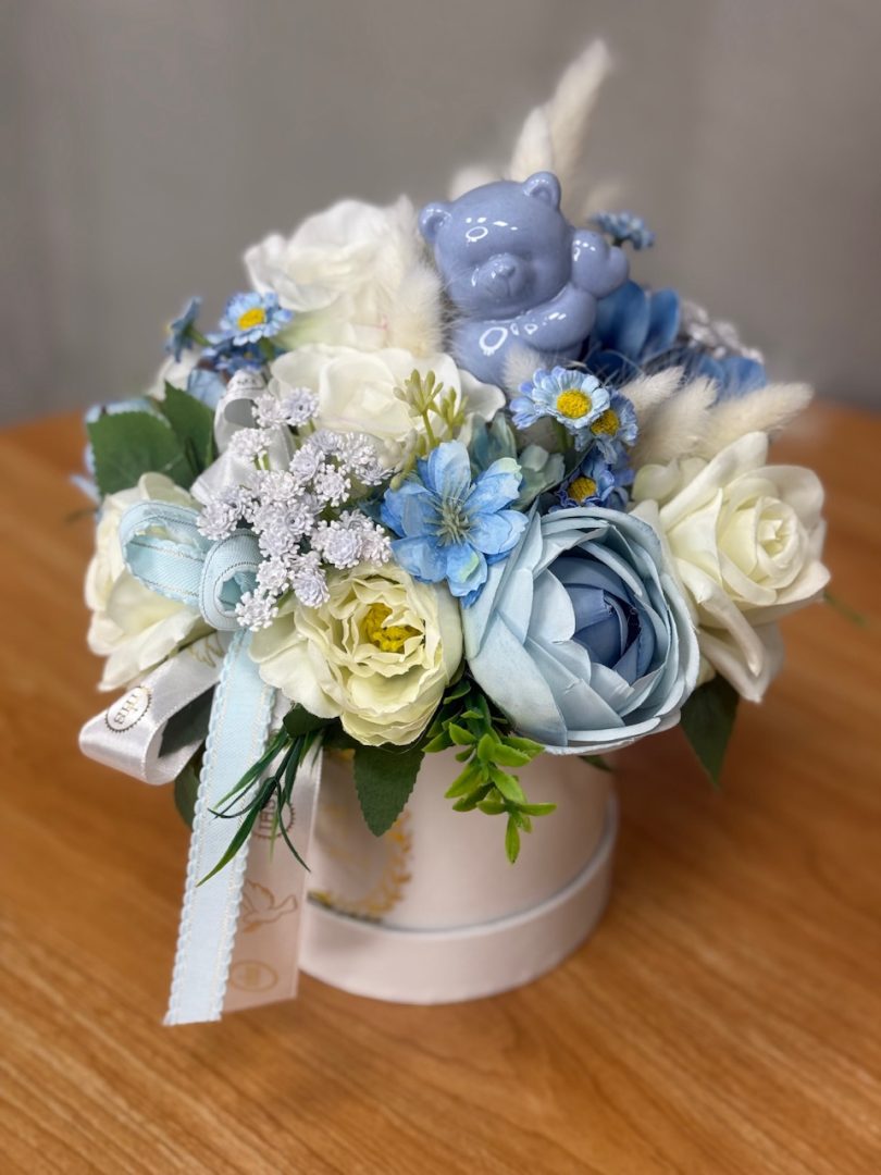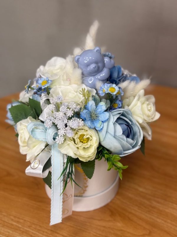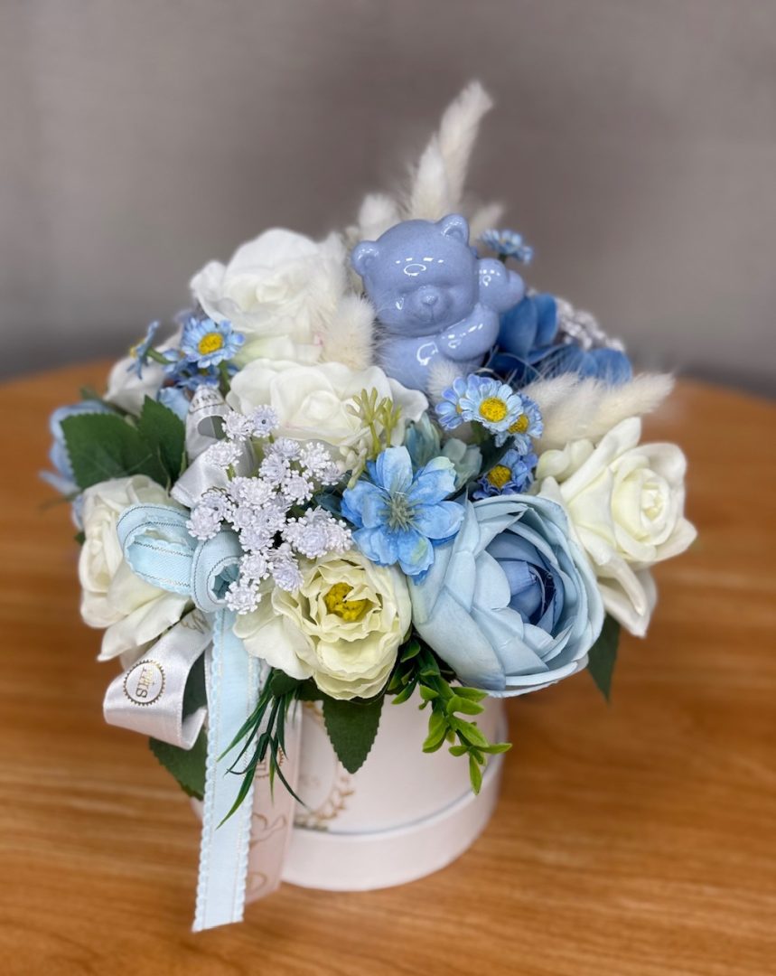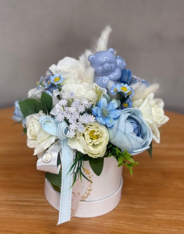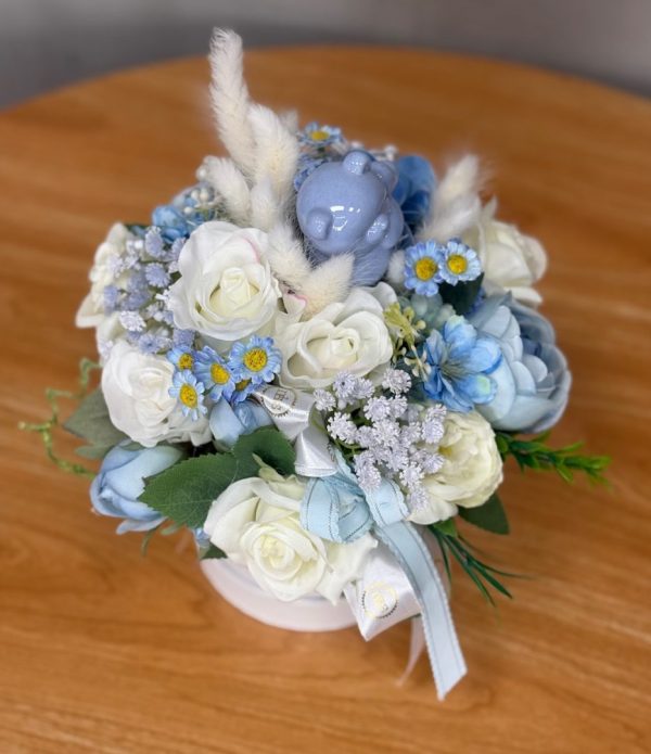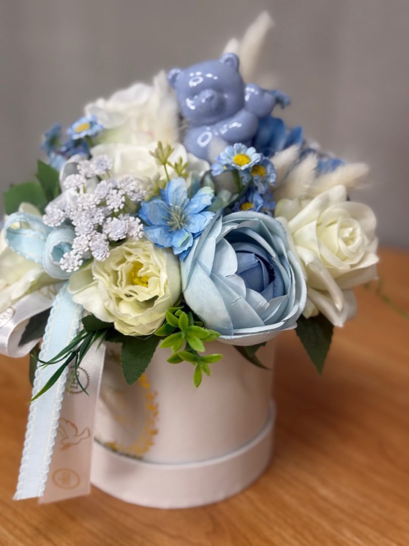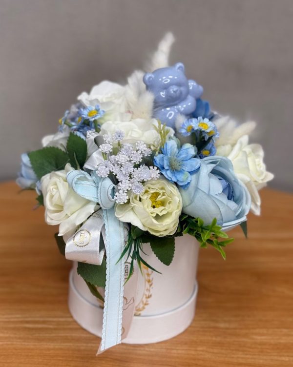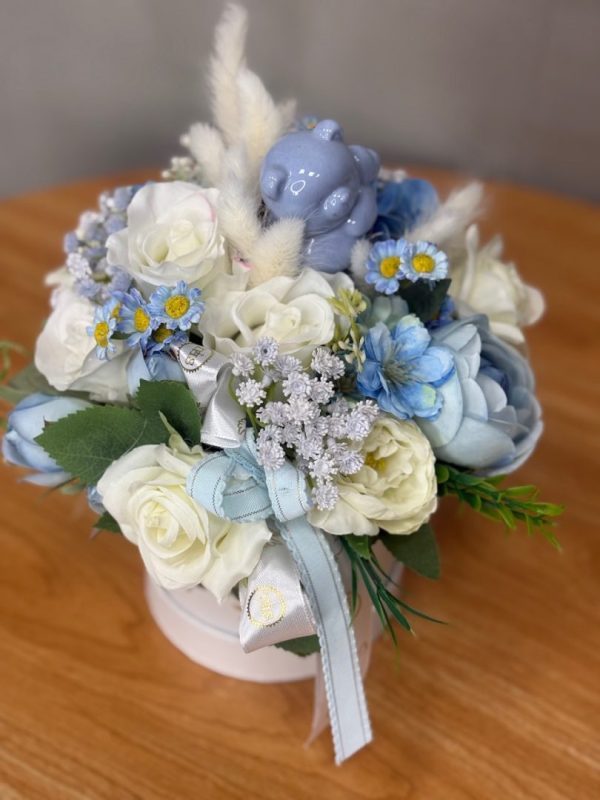 Dekoracja wykonana jest w ozdobnym pudełku na kwiaty.