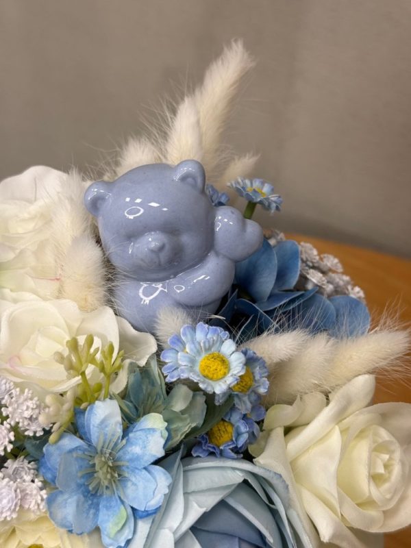 Kompozycja wykonana w całości ze sztucznych kwiatów i dodatków.