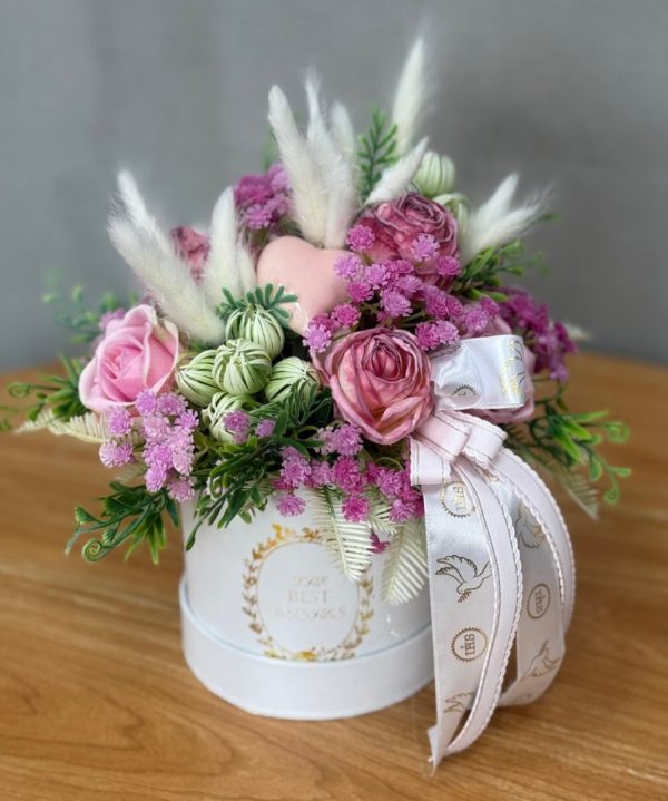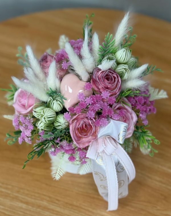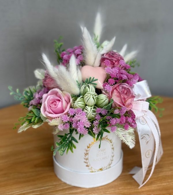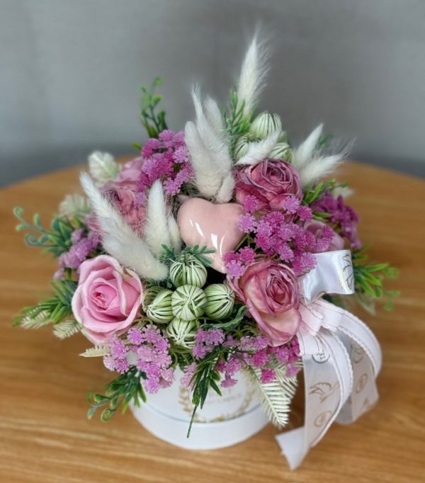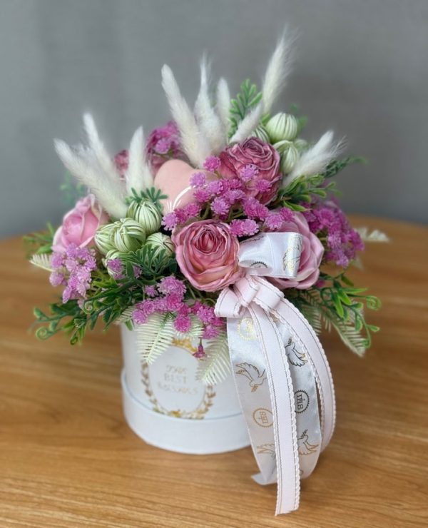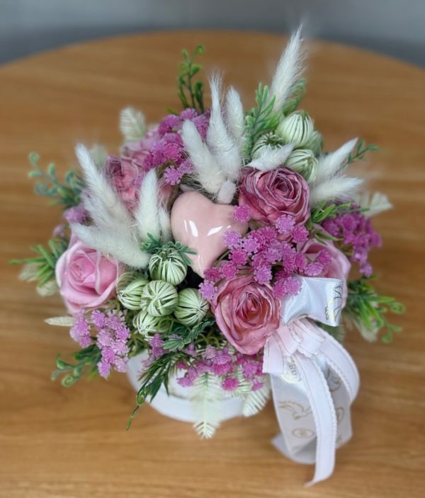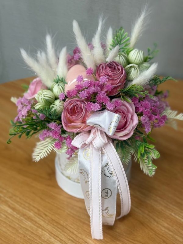 Dekoracja wykonana jest w ozdobnym pudełku na kwiaty.