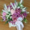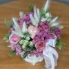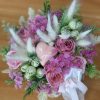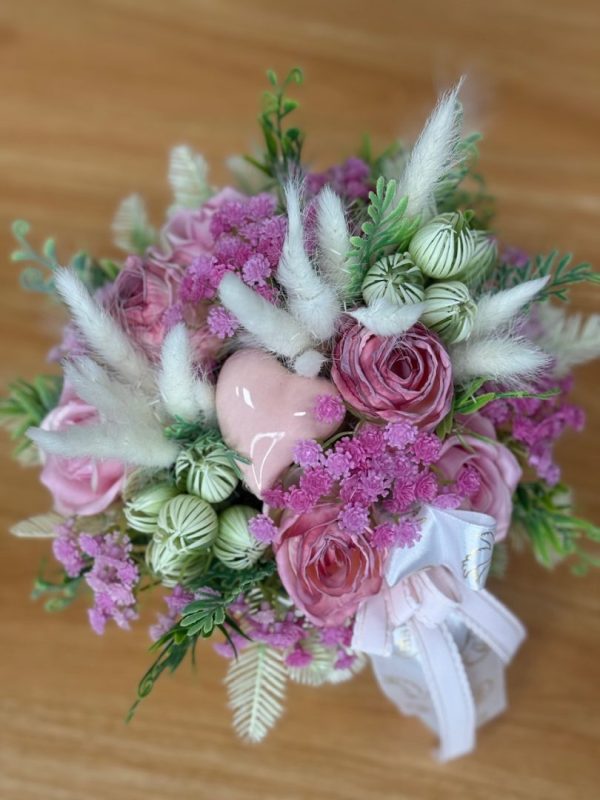 Kompozycja wykonana w całości ze sztucznych kwiatów i dodatków.