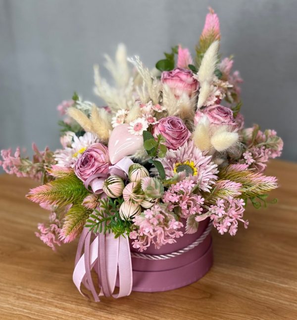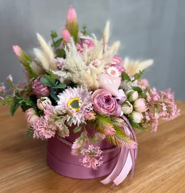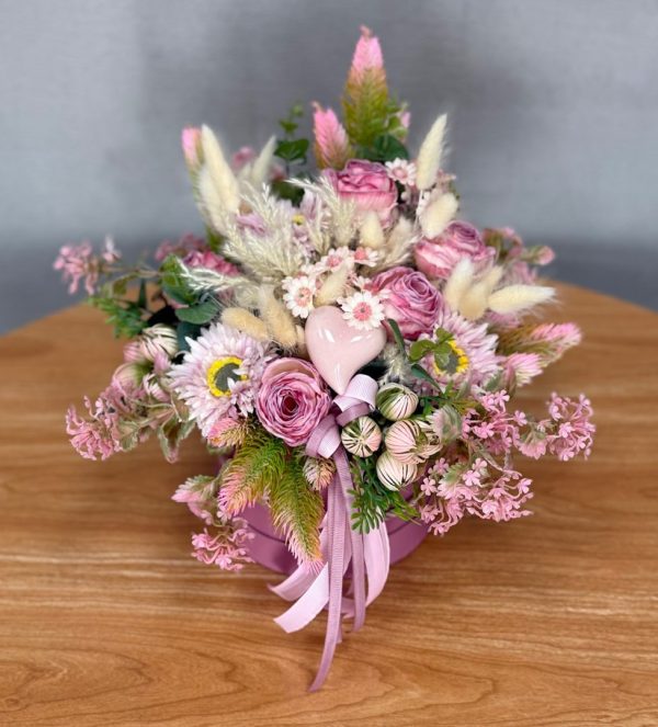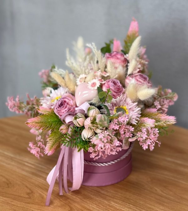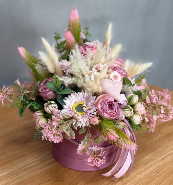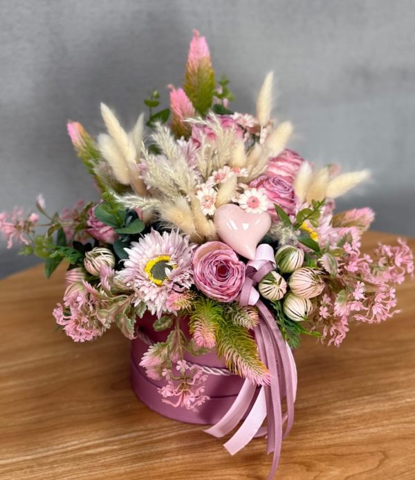 Dekoracja wykonana jest w ozdobnym pudełku na kwiaty.