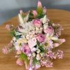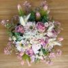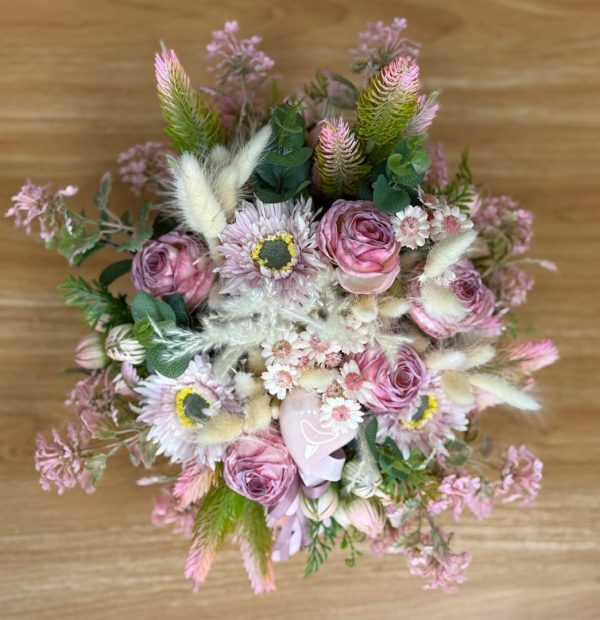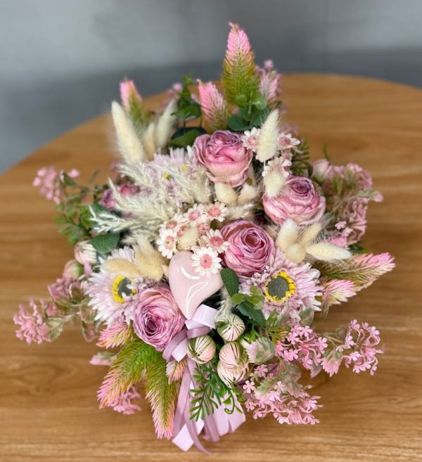 Kompozycja wykonana w całości ze sztucznych kwiatów i dodatków.