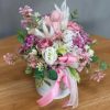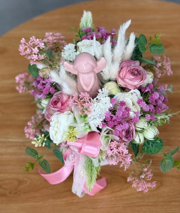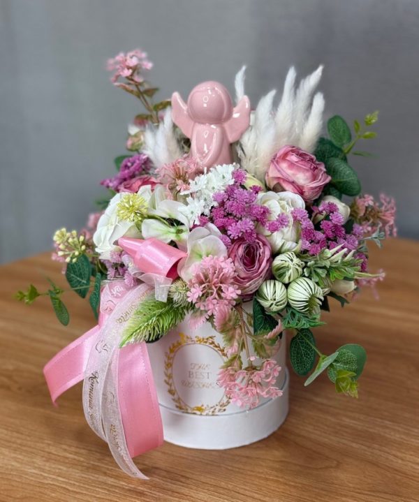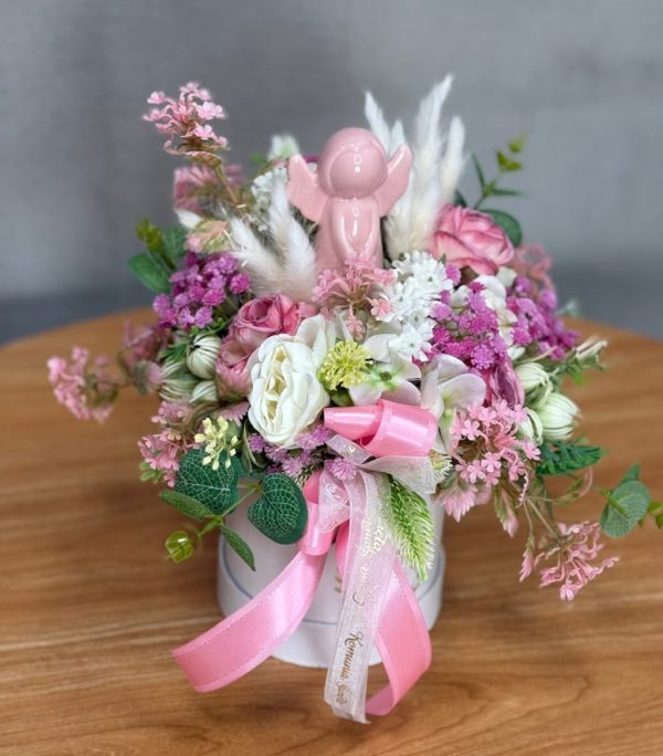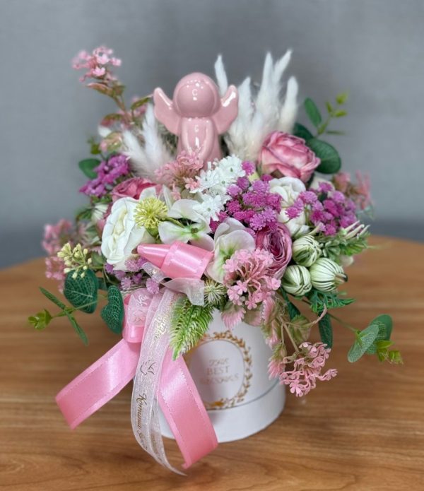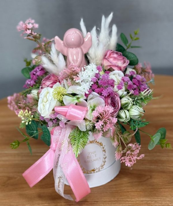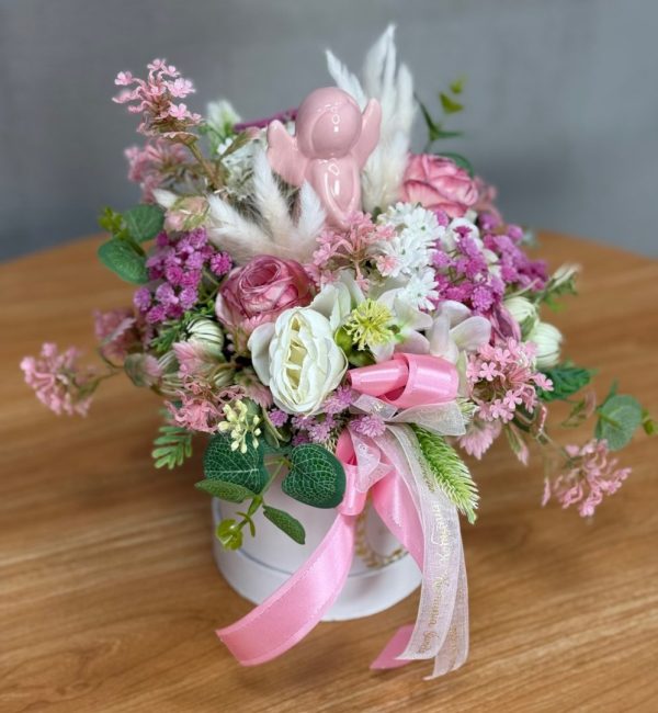 Dekoracja wykonana jest w ozdobnym pudełku na kwiaty.