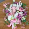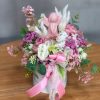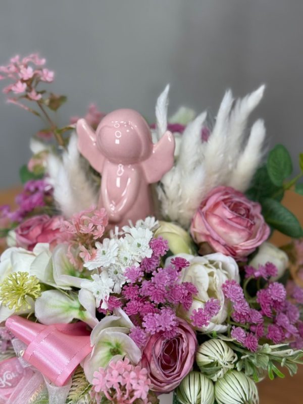 Kompozycja wykonana w całości ze sztucznych kwiatów i dodatków.