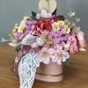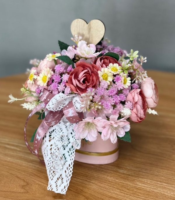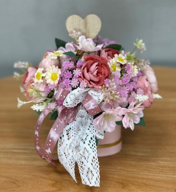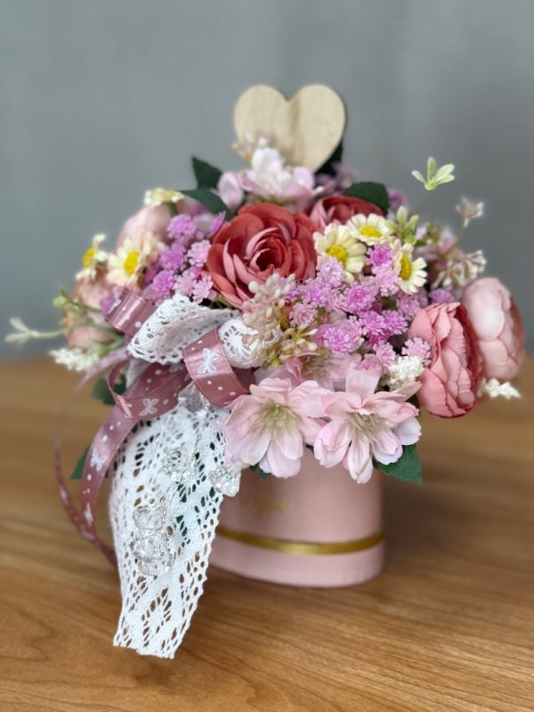 Dekoracja wykonana jest w ozdobnym pudełku na kwiaty.