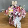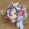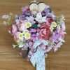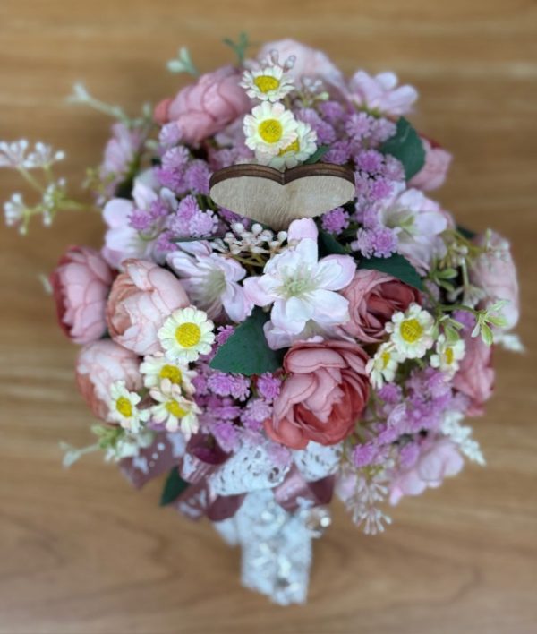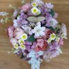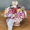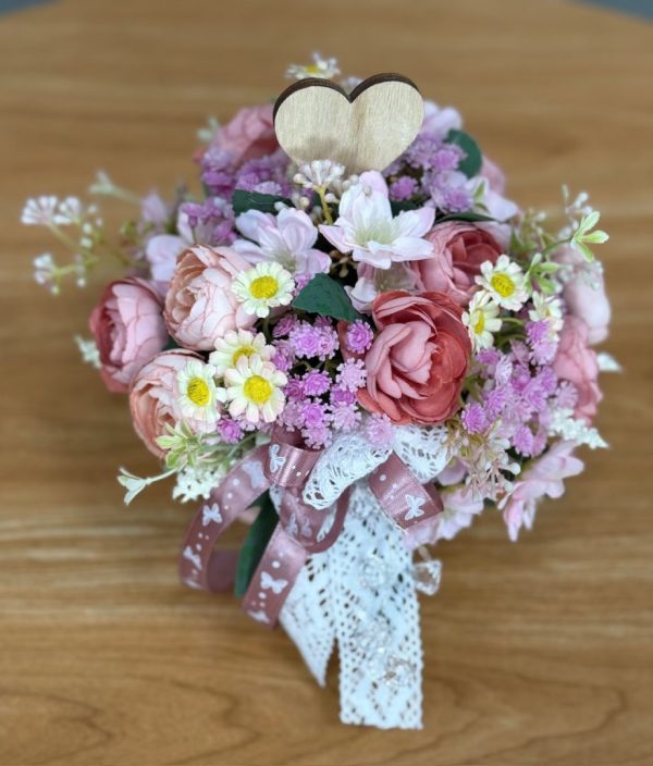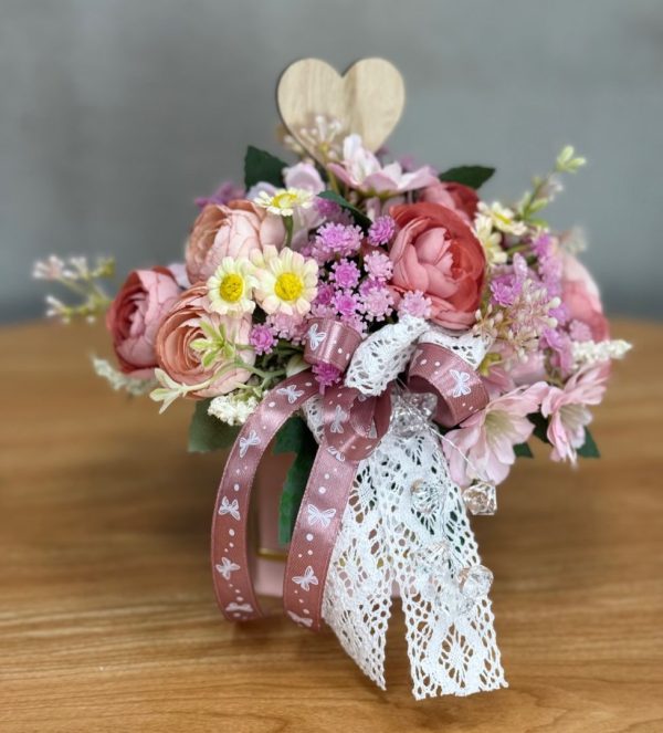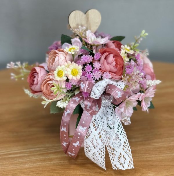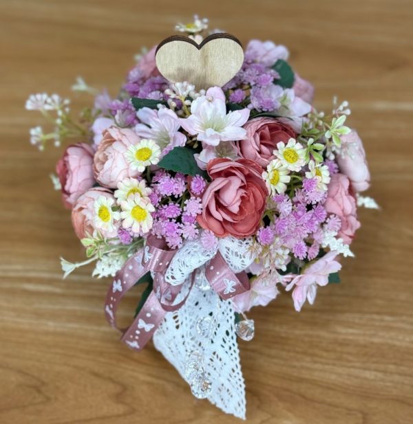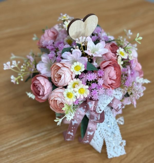 Kompozycja wykonana w całości ze sztucznych kwiatów i dodatków.