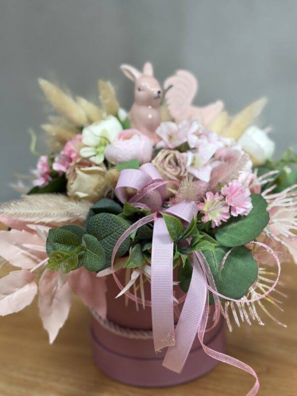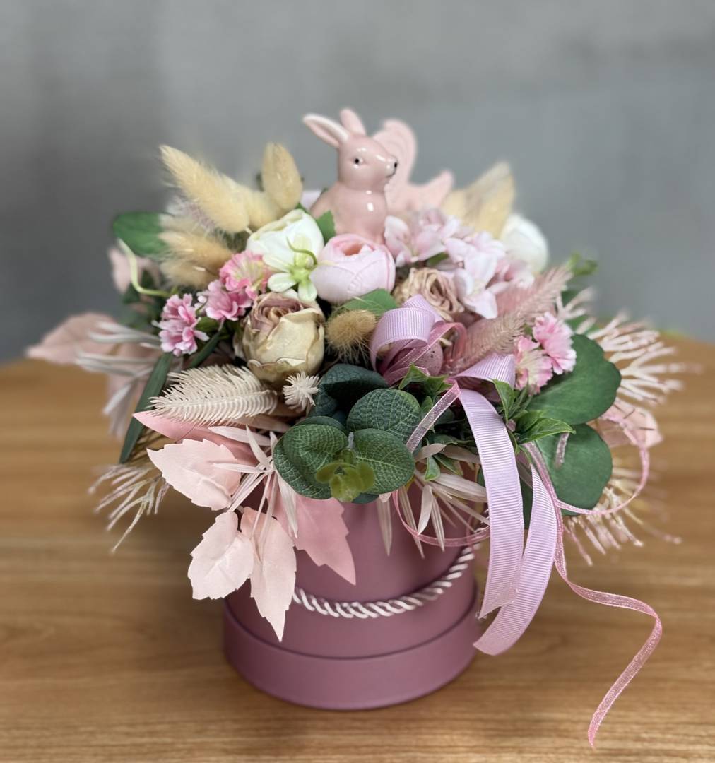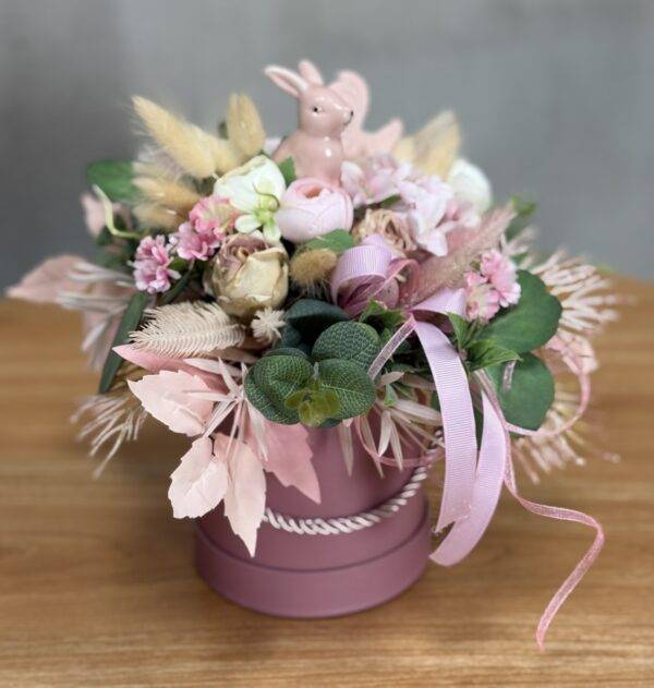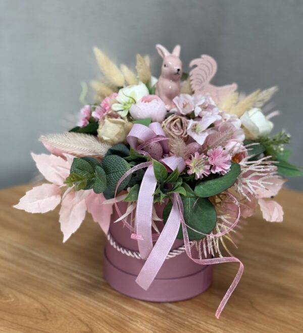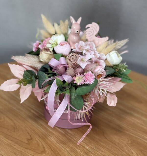 Dekoracja wykonana jest w ozdobnym pudełku na kwiaty.
