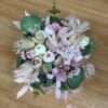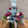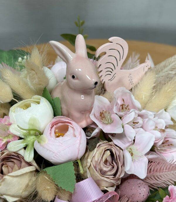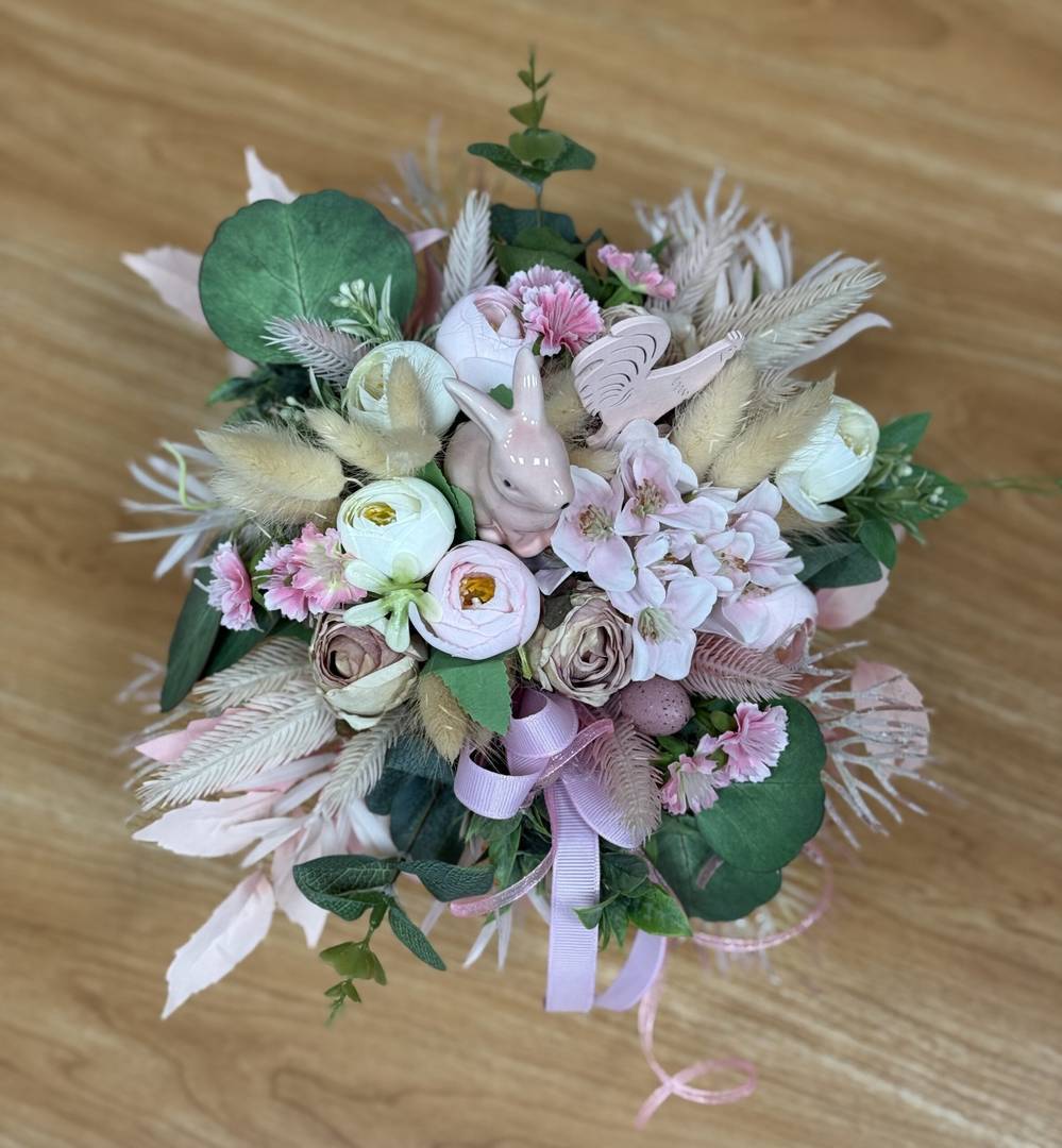 Kompozycja wykonana w całości ze sztucznych kwiatów i dodatków.