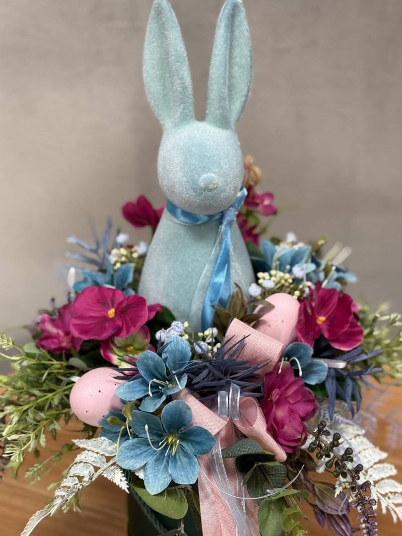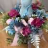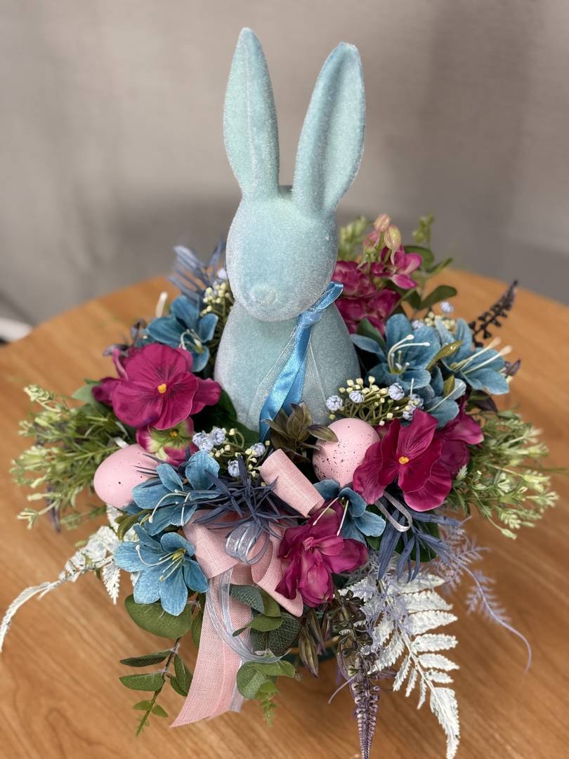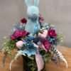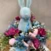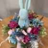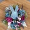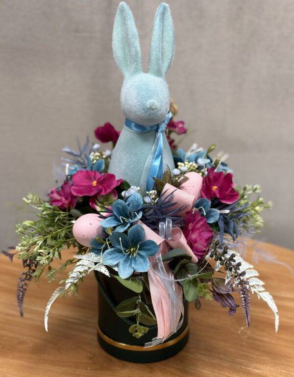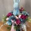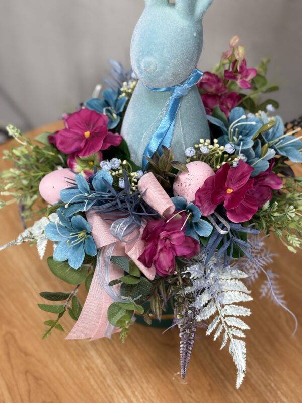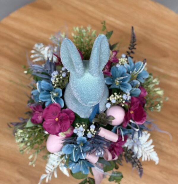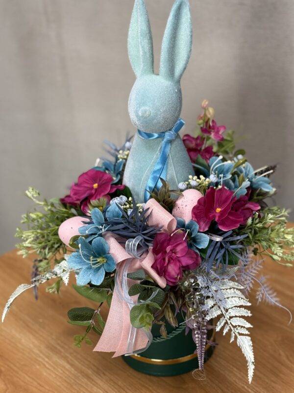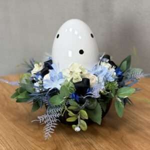 Kompozycja wykonana w całości ze sztucznych kwiatów i dodatków.