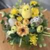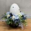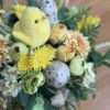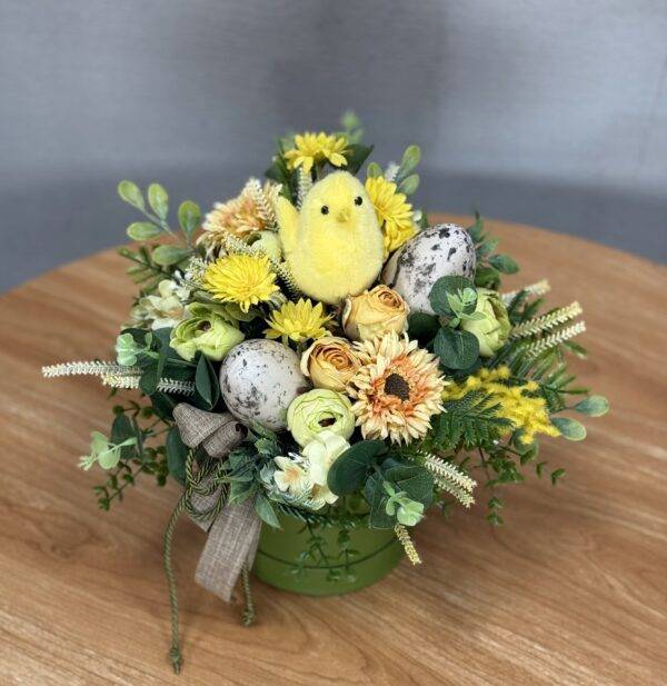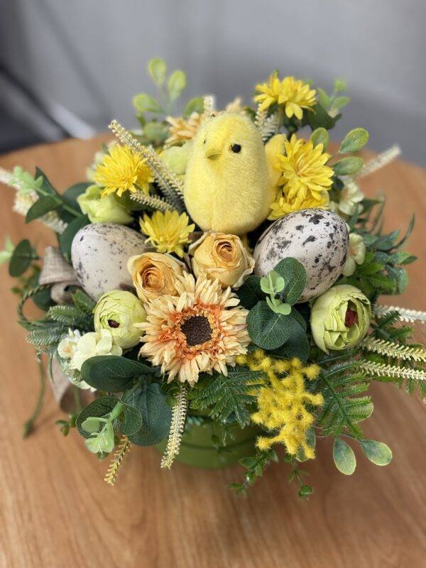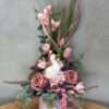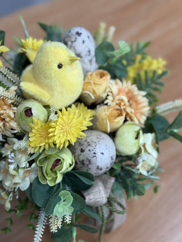 Kompozycja wykonana w całości ze sztucznych kwiatów i dodatków.