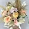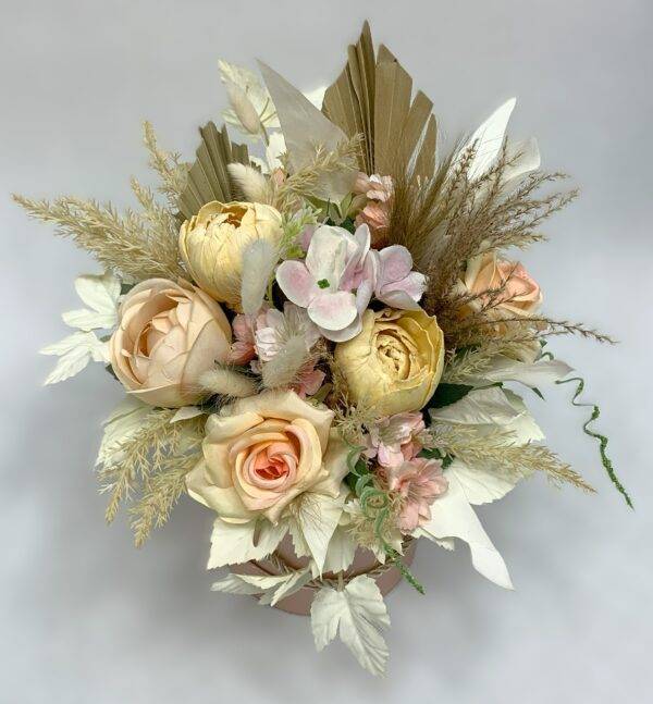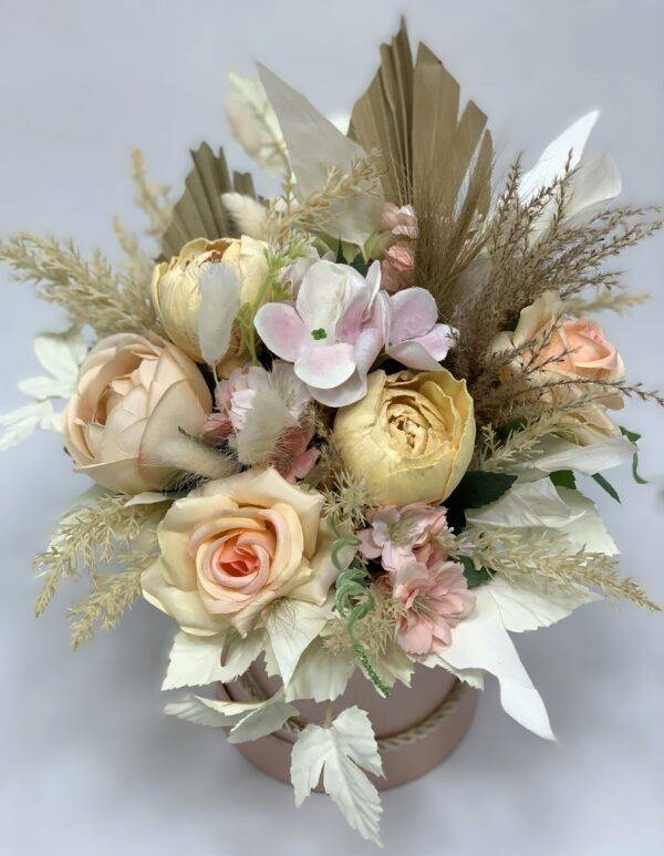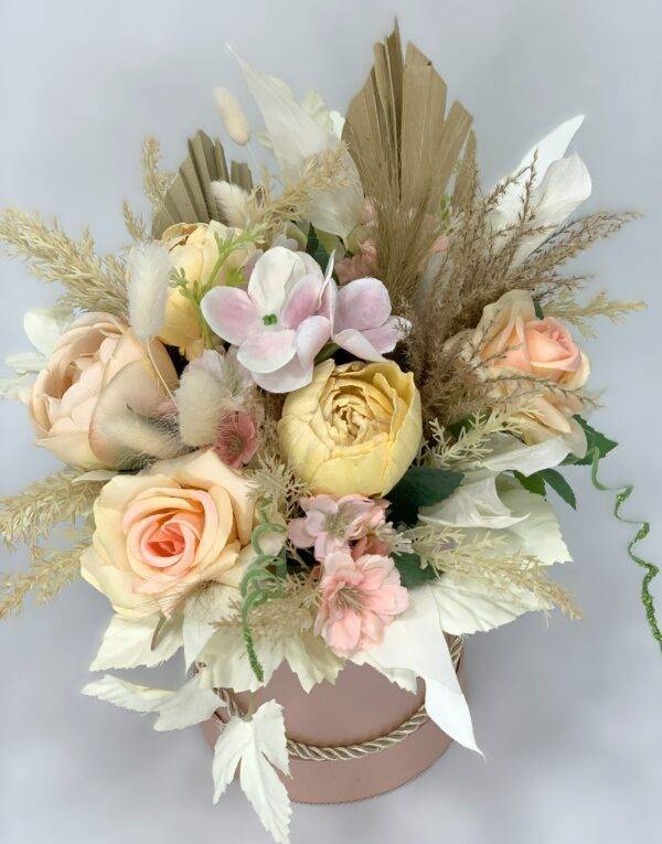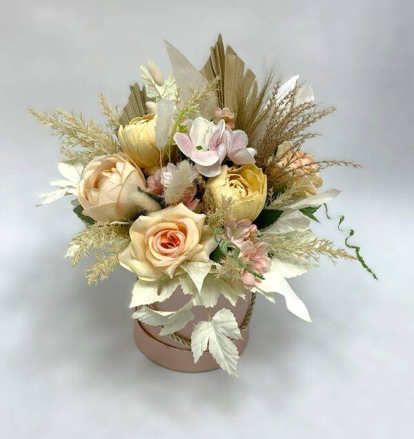Elegancki flower box w kolorze żółtym z lekkim dodatkiem różowego i suszu naturalnego.