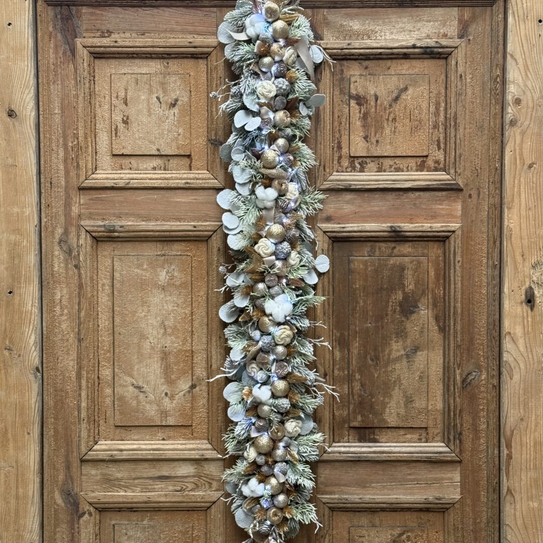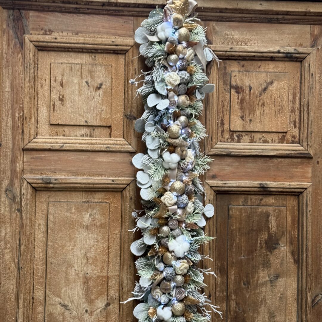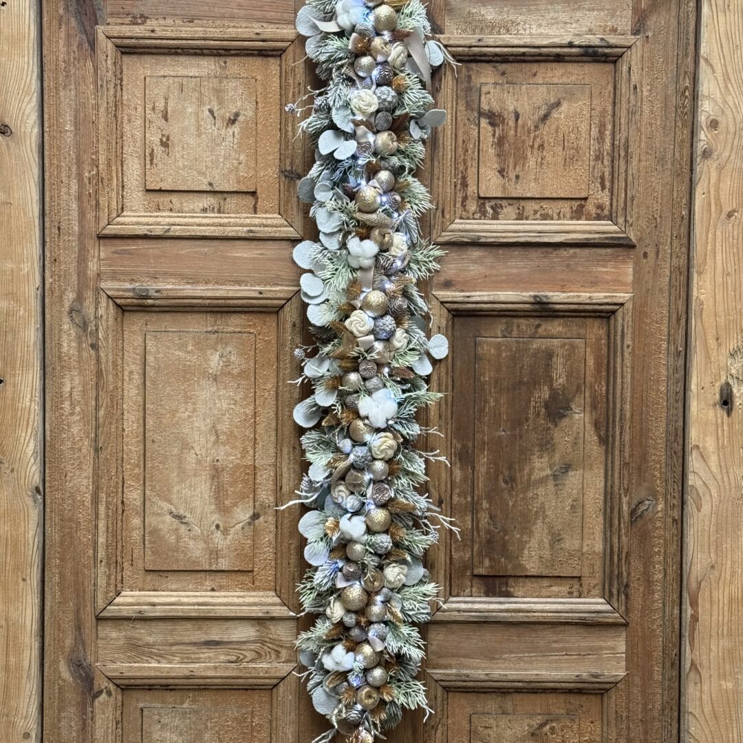 Girlanda wykonana ze sztucznych świerkowych gałązek.