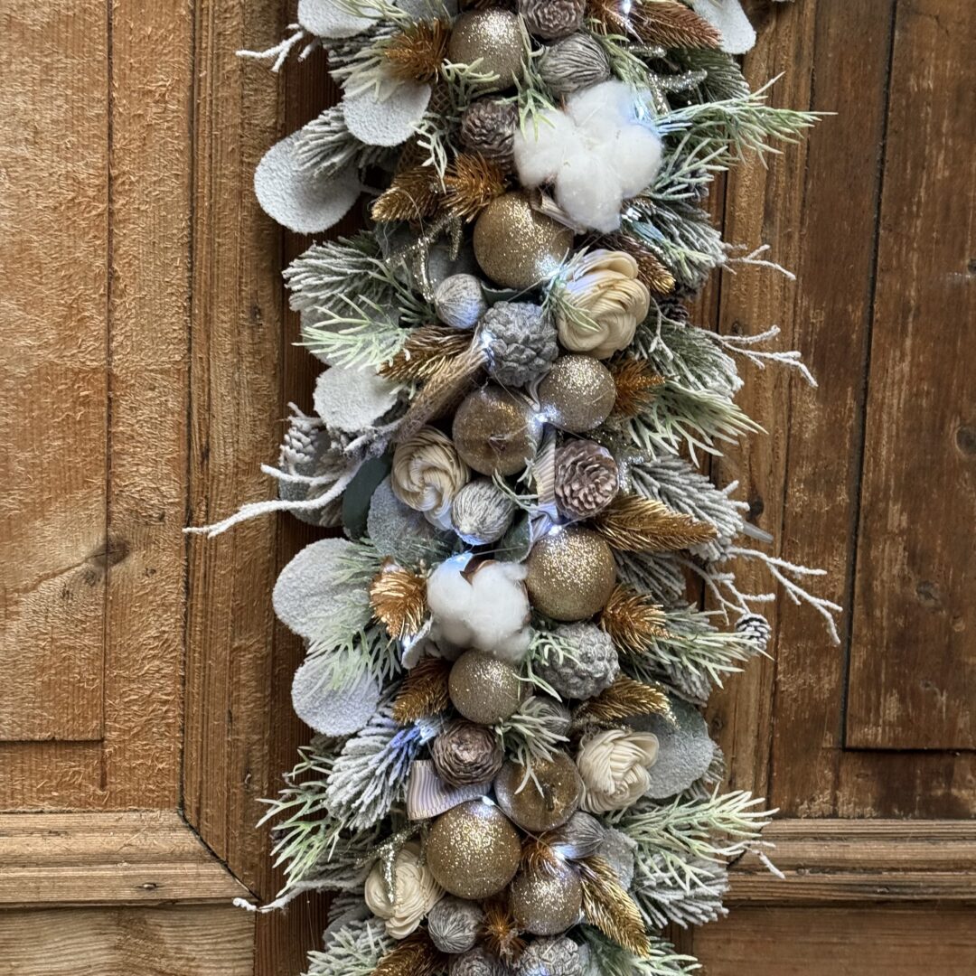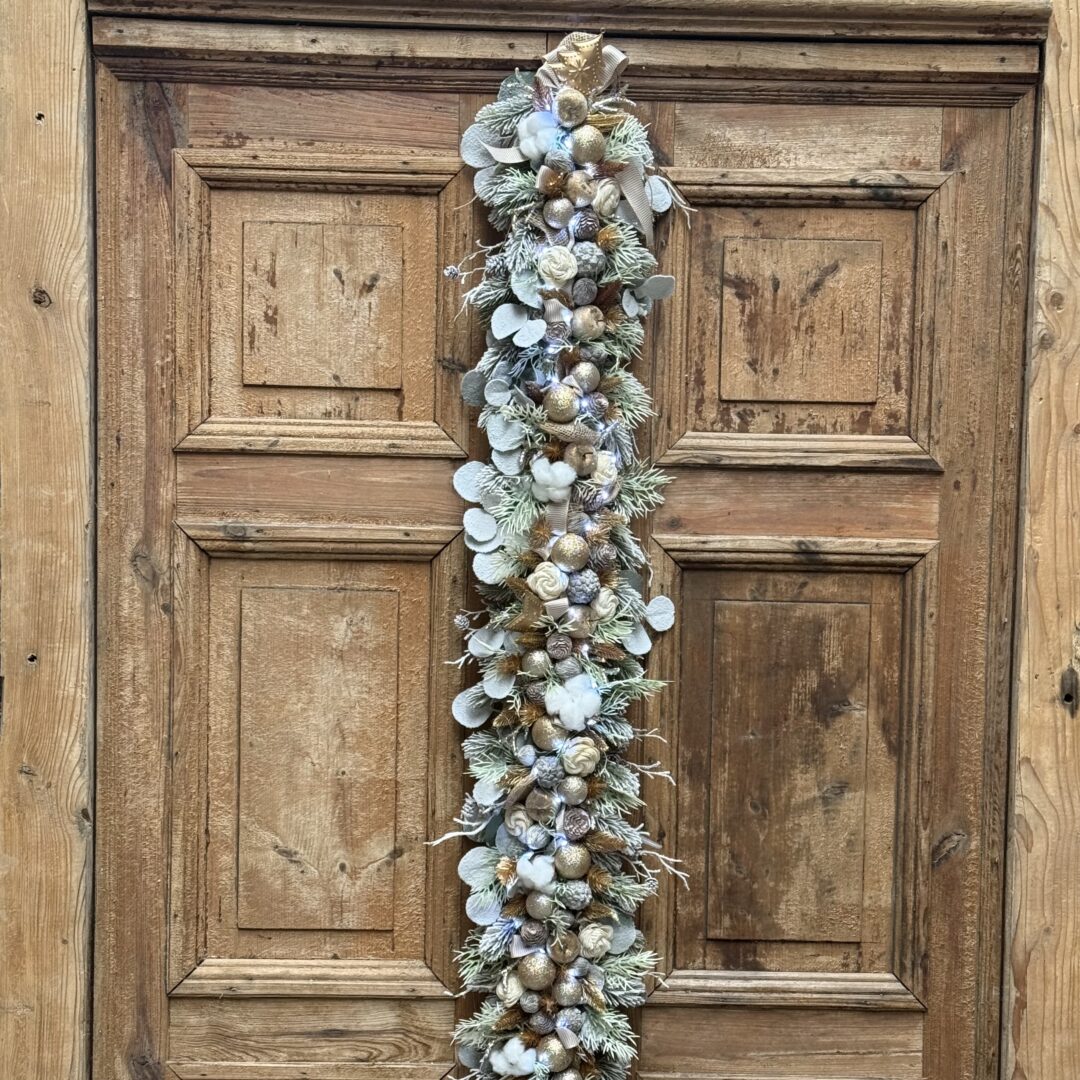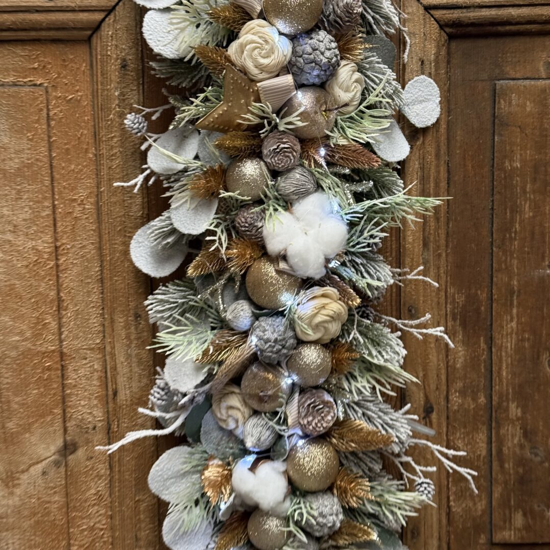 Girlanda wykonana ze sztucznych świerkowych gałązek.