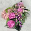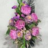 Bukiet ułożony we wkładzie o standardowych wymiarach 16 cm, wysokość razem z wkładem około 62 cm, szerokość około 50 cm.