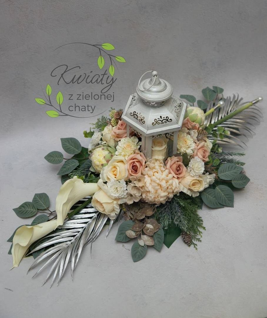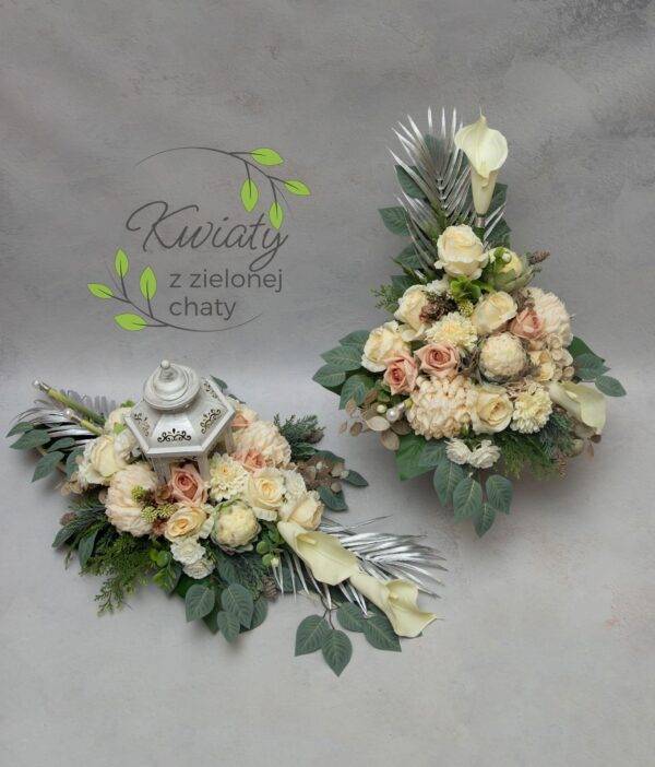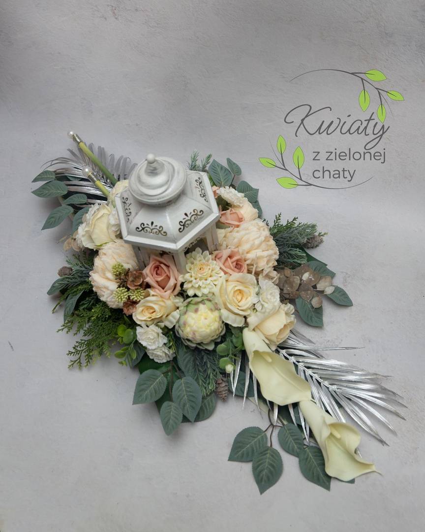 Komplet nagrobny latarnia z kaliami i srebrnymi dodatkami.