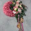 Bukiet ułożony we wkładzie o standardowych wymiarach 16 cm, wysokość razem z wkładem około 59 cm, szerokość około 46 cm.
