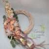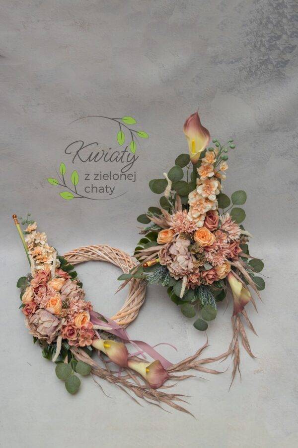 Komplet nagrobny z wiklinowym wiankiem z kwiatami w kolorach pudrowych.