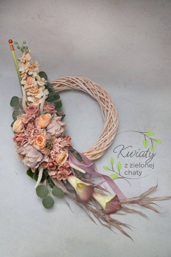 Dekoracja do położenia na wiklinowym wianku o średnicy około 40 cm i długości z wszystkimi wystającymi elementami 81 cm.