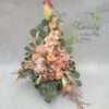 Bukiet ułożony we wkładzie o standardowych wymiarach 16 cm, wysokość razem z wkładem około 63 cm, szerokość około 46 cm.