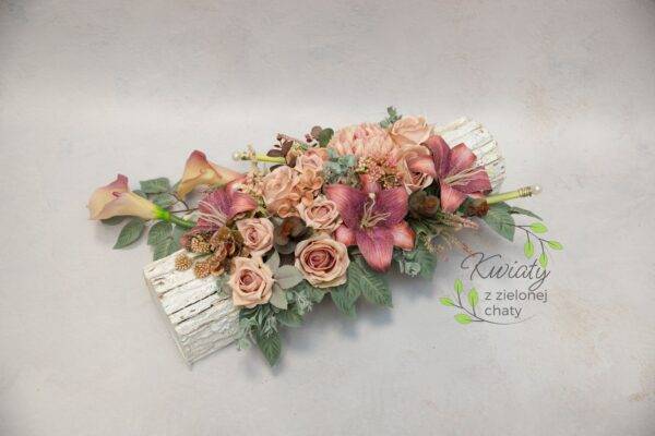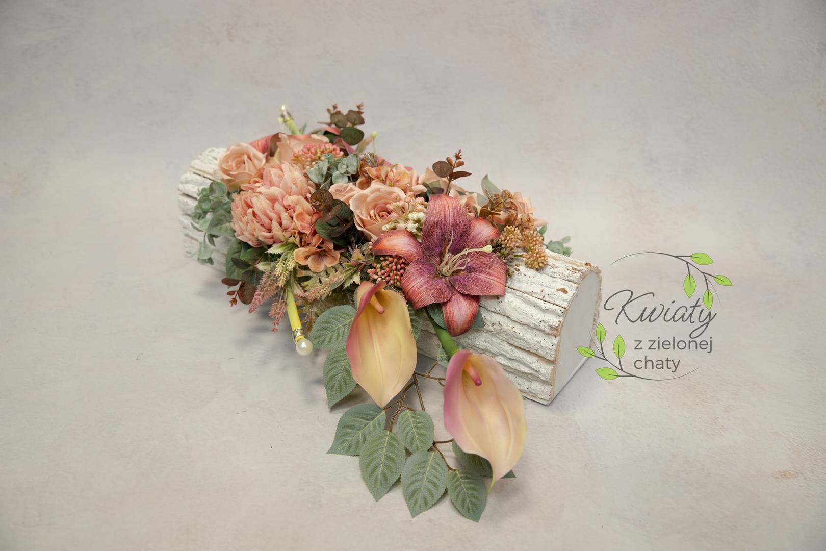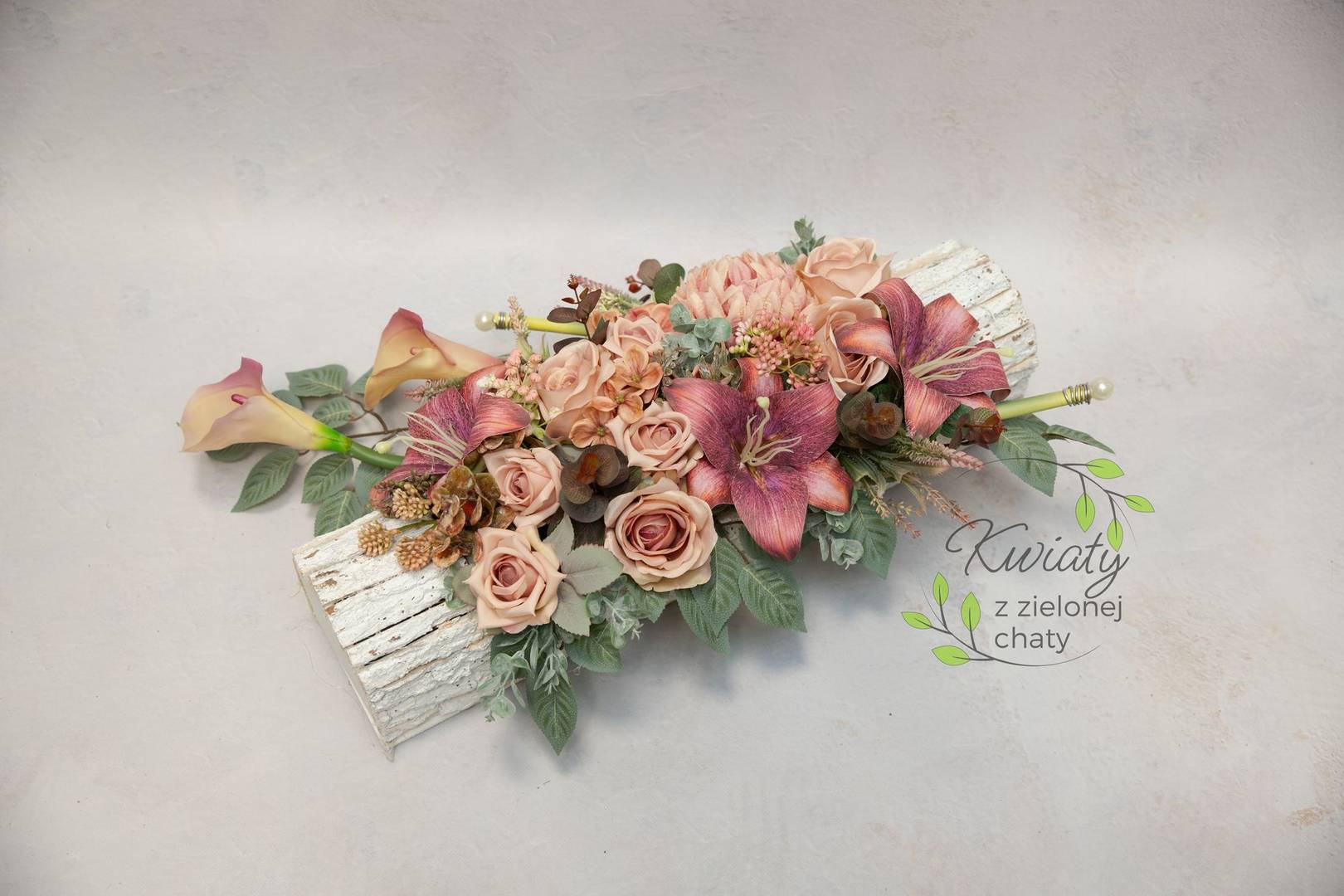 Kompozycja do położenia na płytę nagrobną w drewnianym pojemniku z lilią i łososiową kalią. Długość pojemnika 60 cm, szerokość 14 cm.