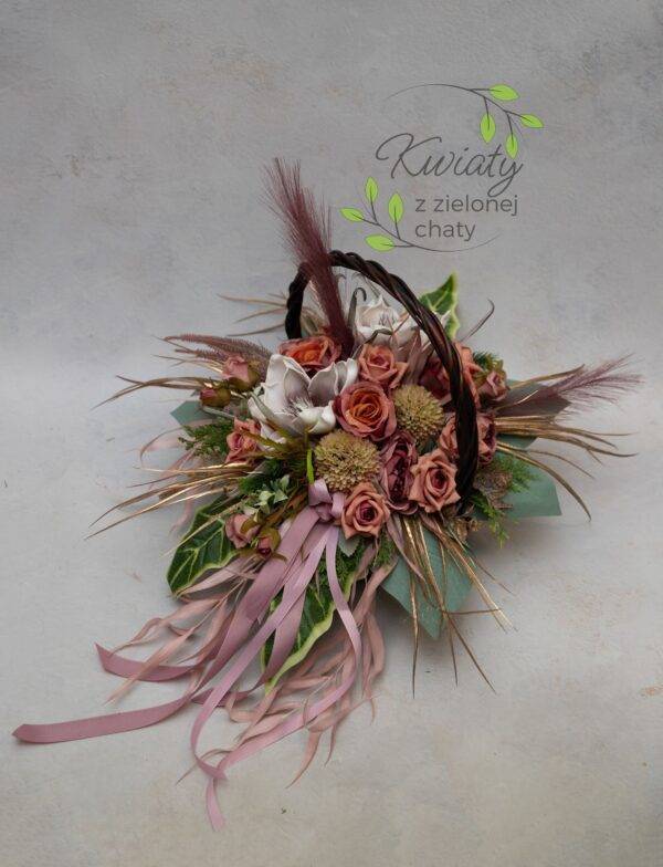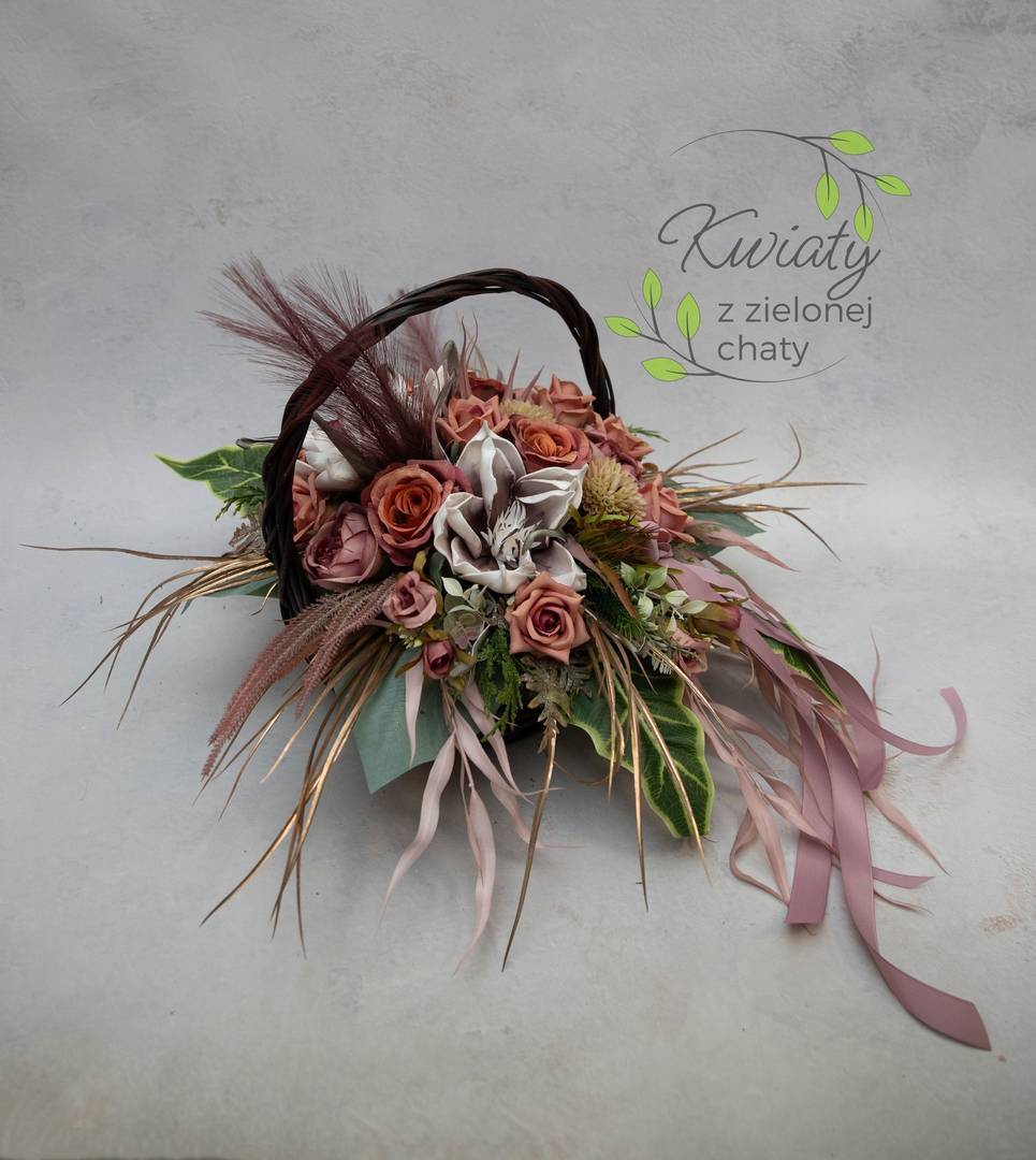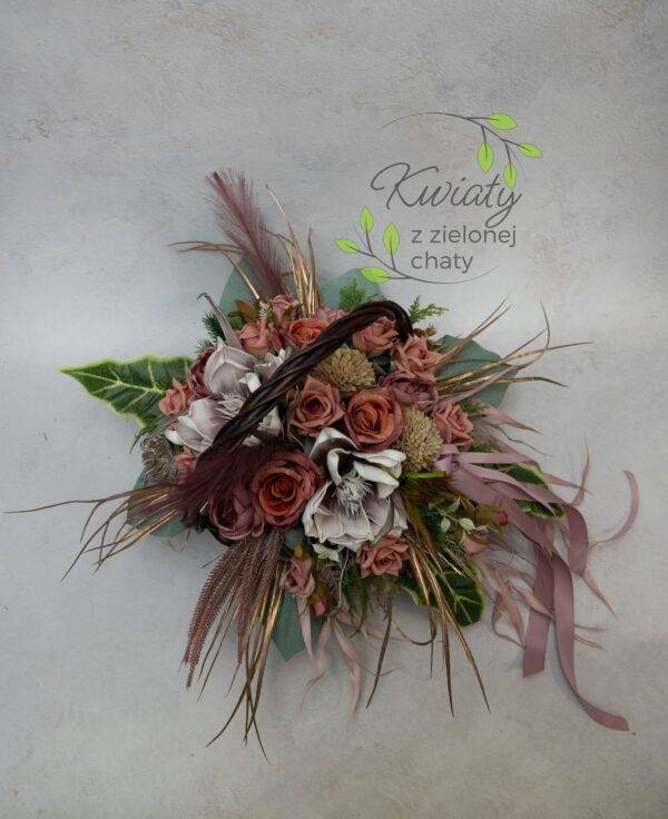 Kompozycja na grób w wiklinowym koszyku i kwiatami w jesiennych kolorach nr 340