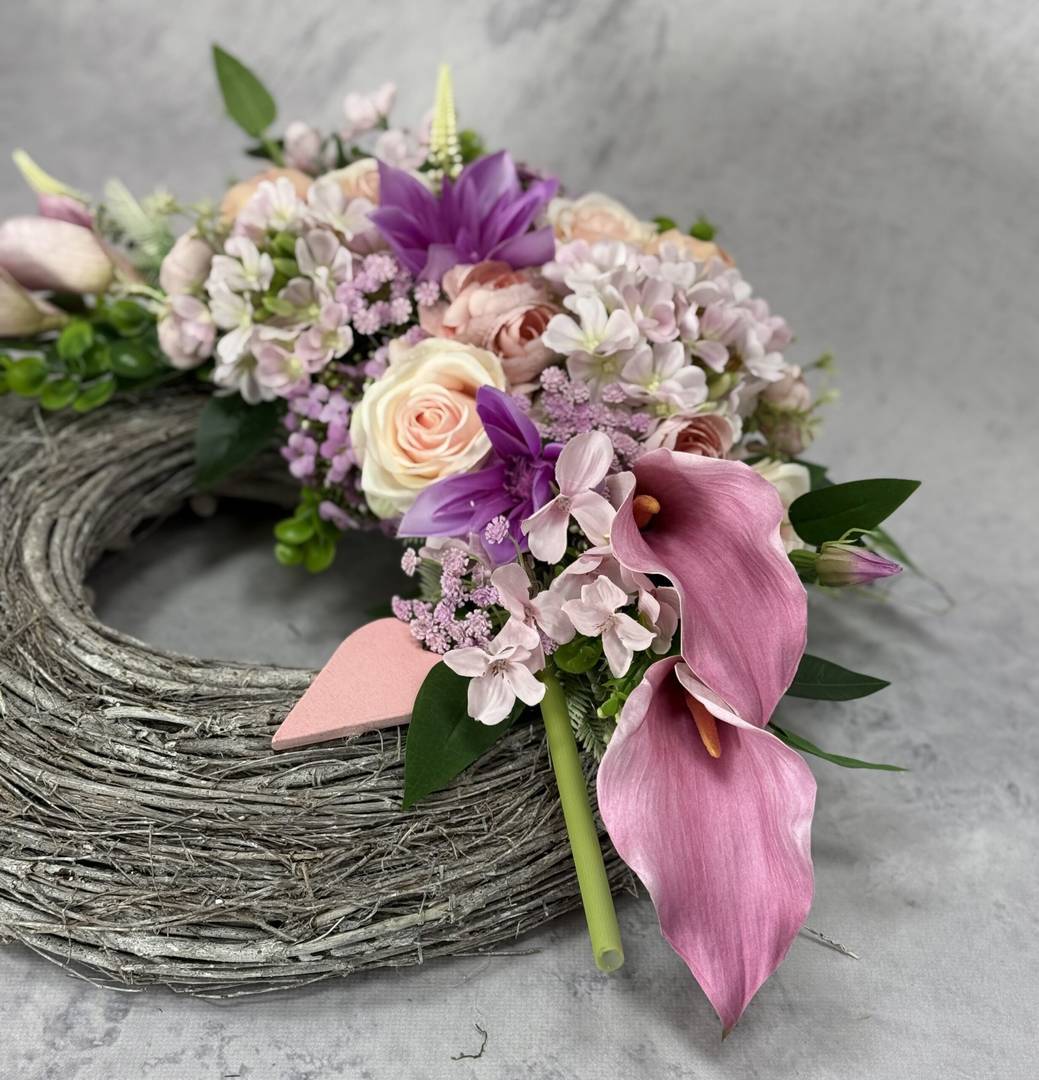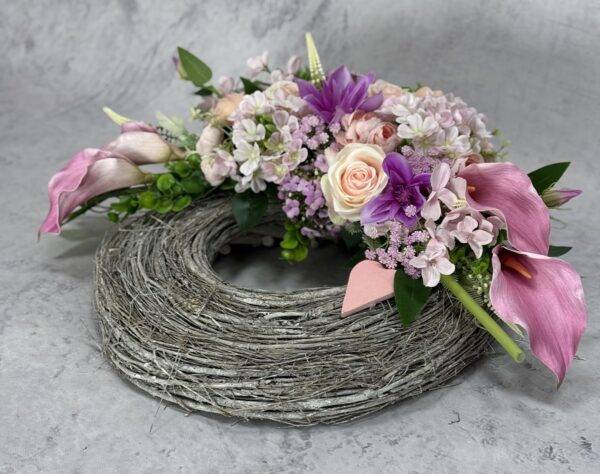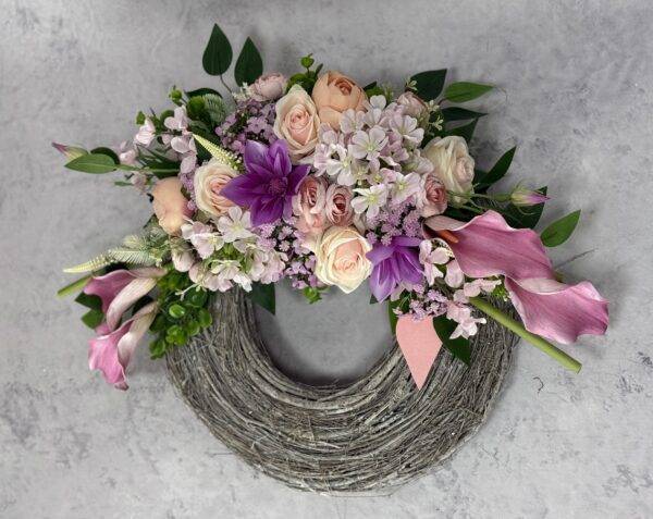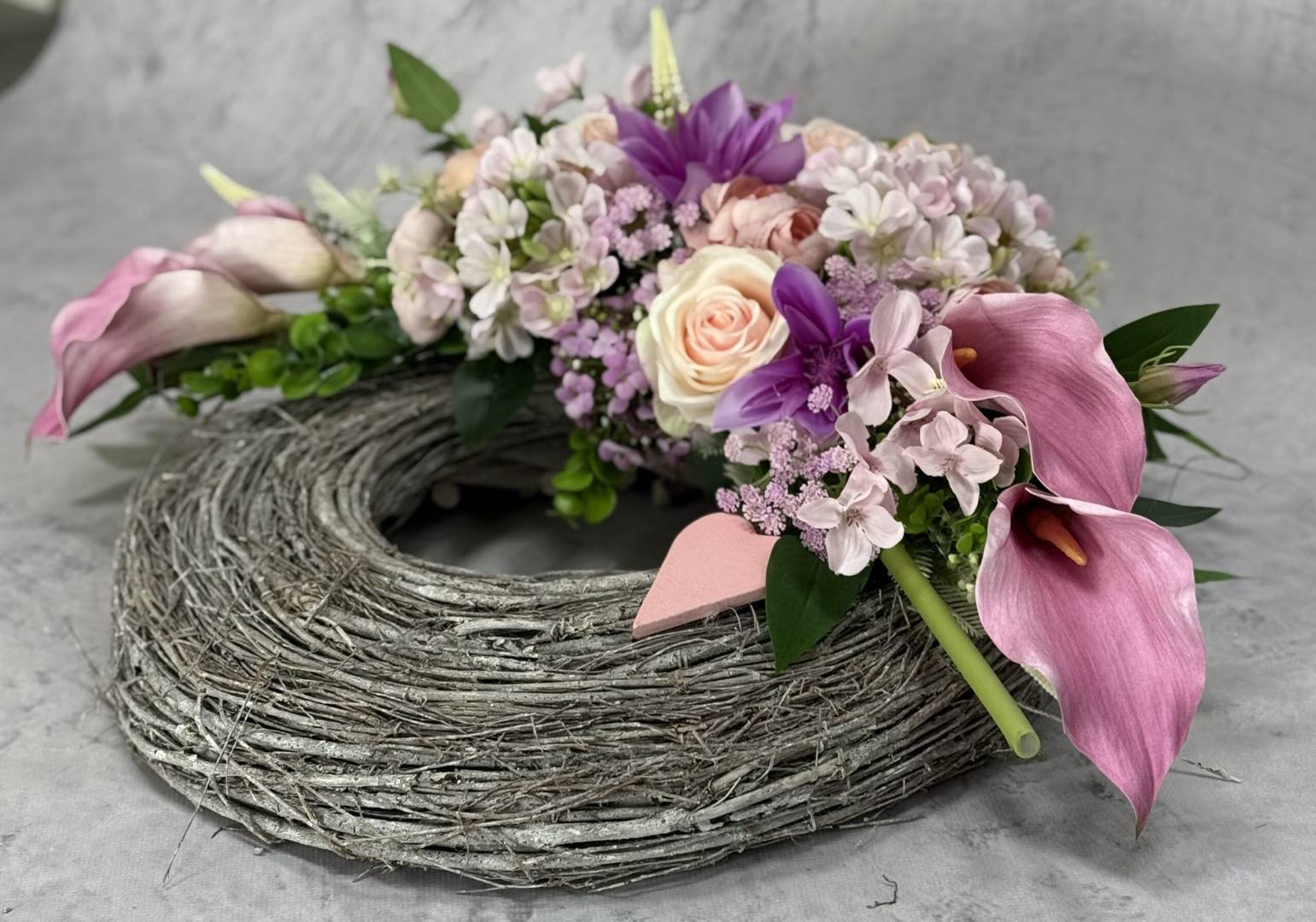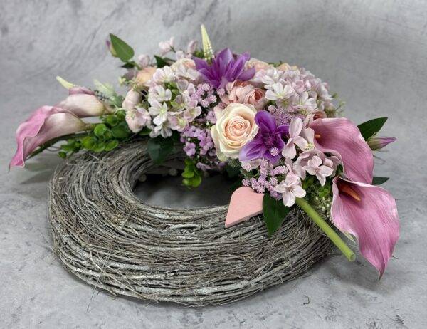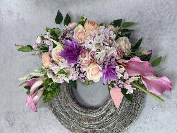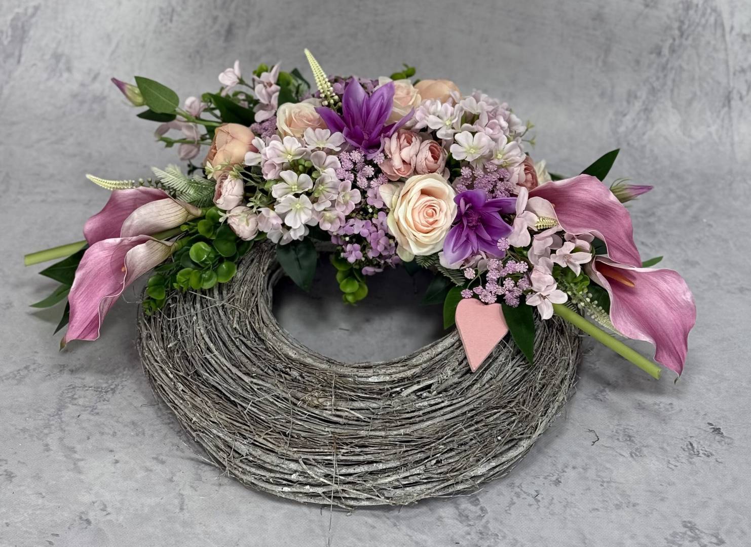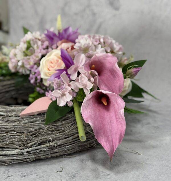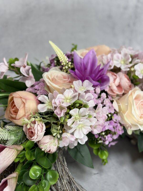 Dekoracja do położenia na wiklinowym wianku – długość około 65 cm, szerokość około 50 cm.