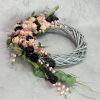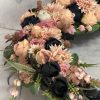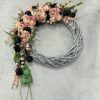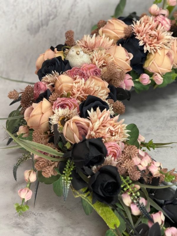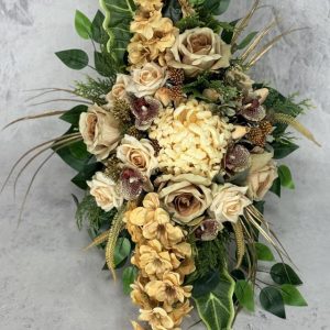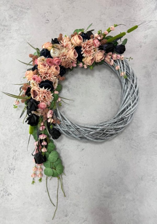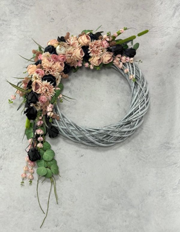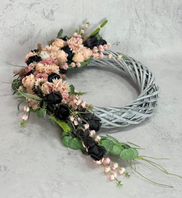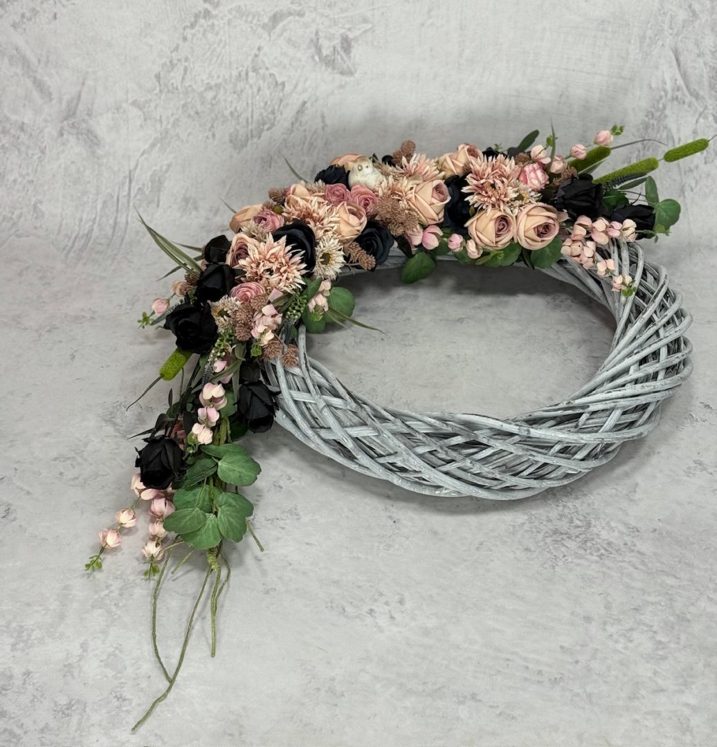 Dekoracja do położenia na grób wykonana na szarym wiklinowym wianku – długość około 900 cm, szerokość około 65 cm.