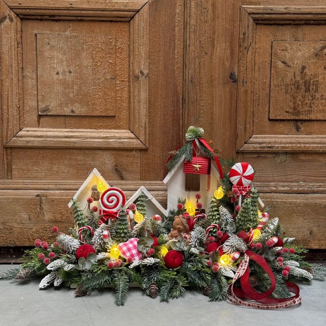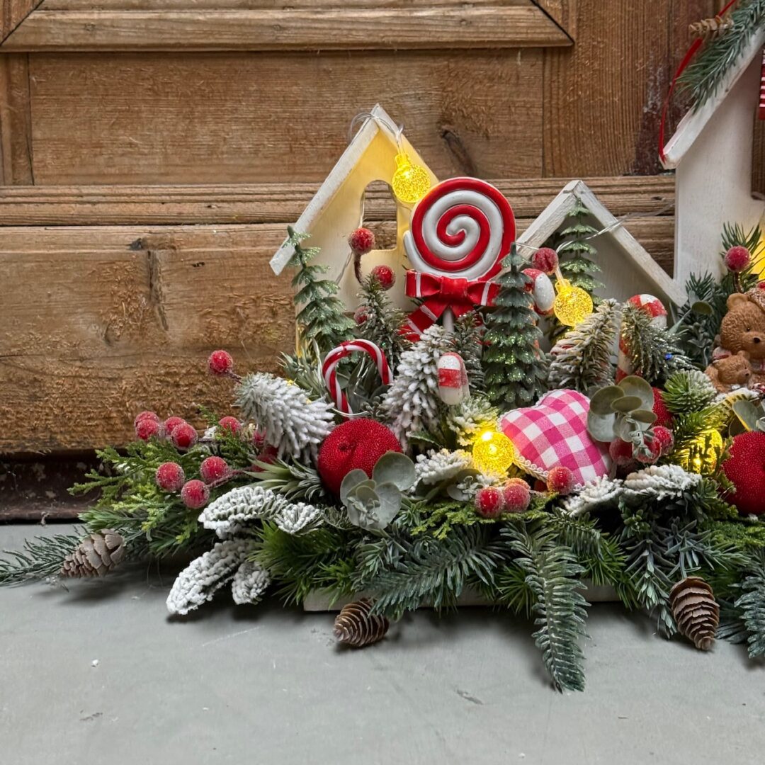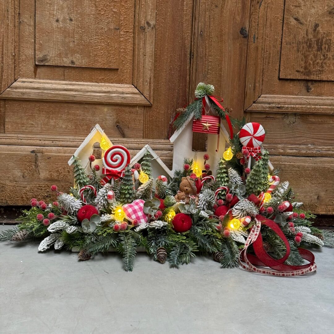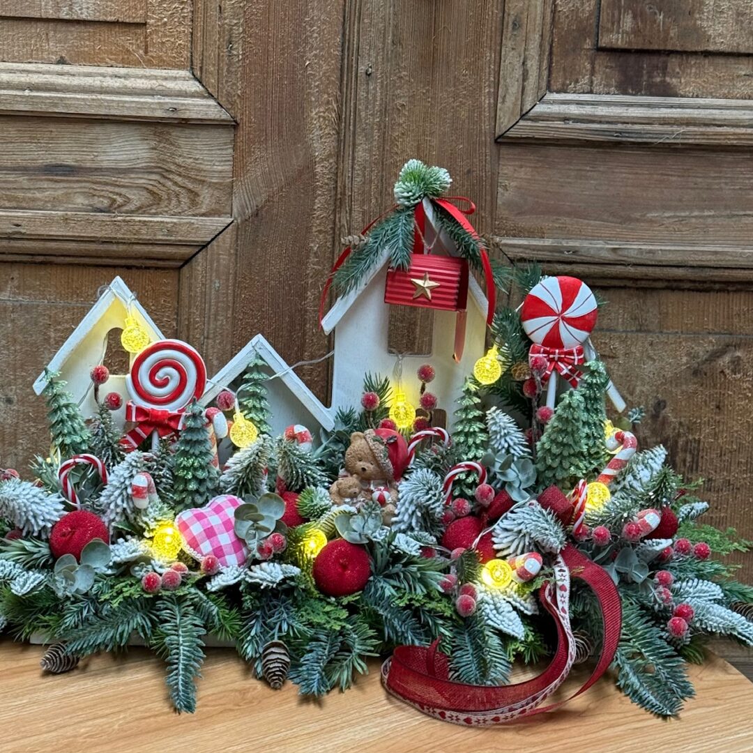 Kompozycja wykonany ze sztucznych świerkowych gałązek. Podstawa – drewniane domki.