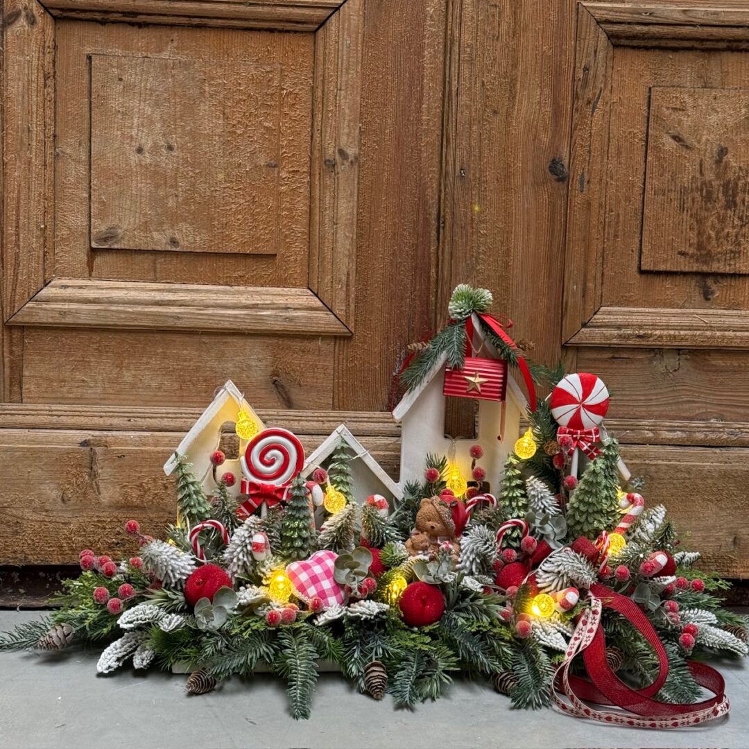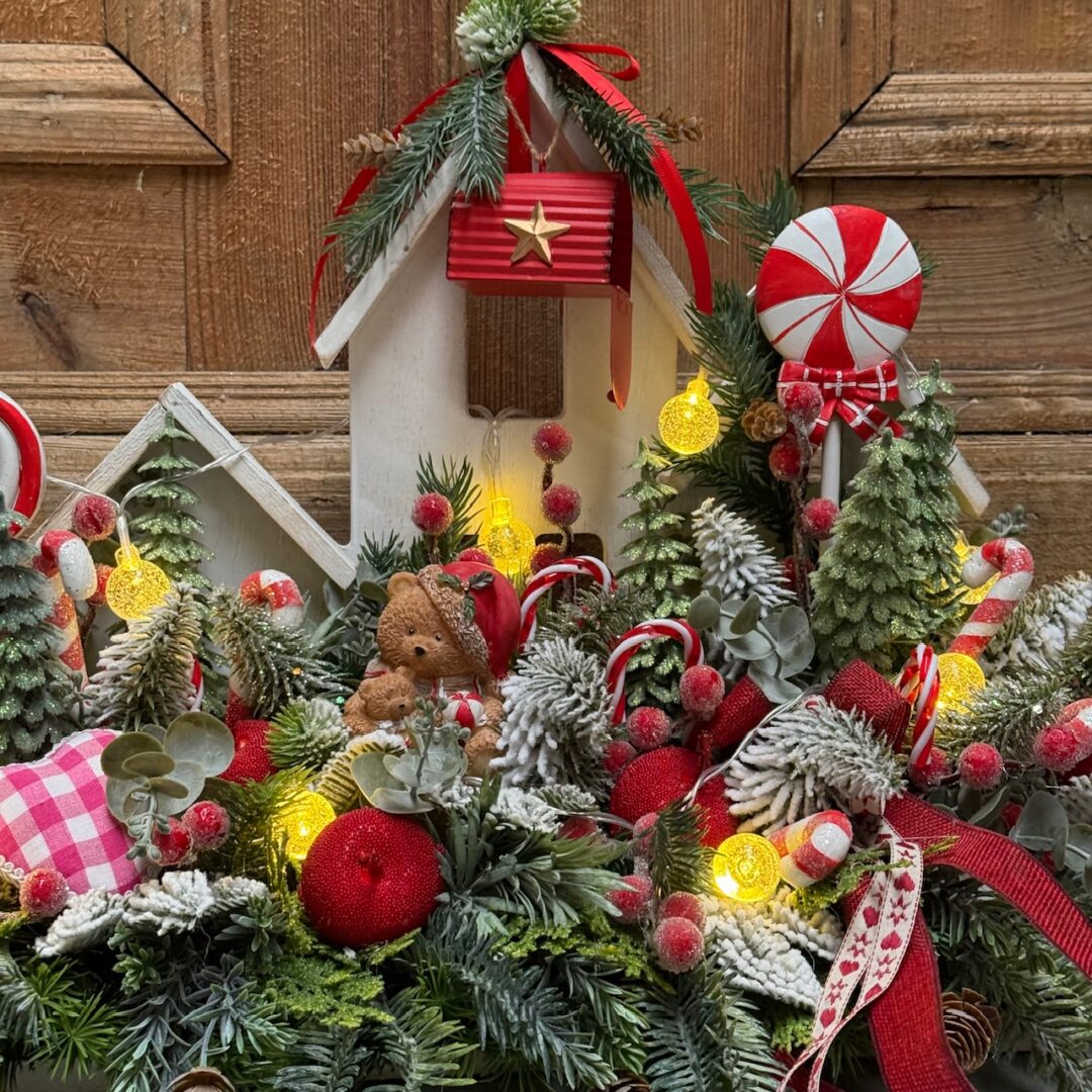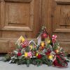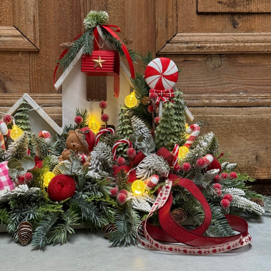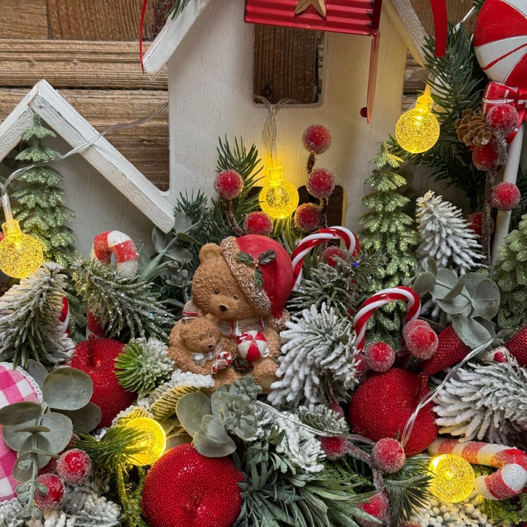 Kompozycja wykonany ze sztucznych świerkowych gałązek. Podstawa – drewniane domki.