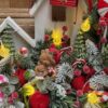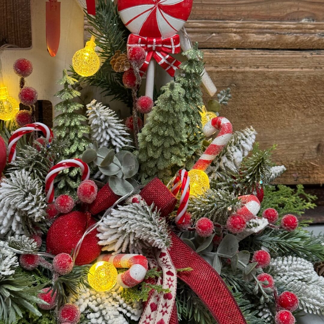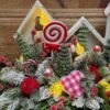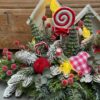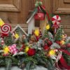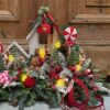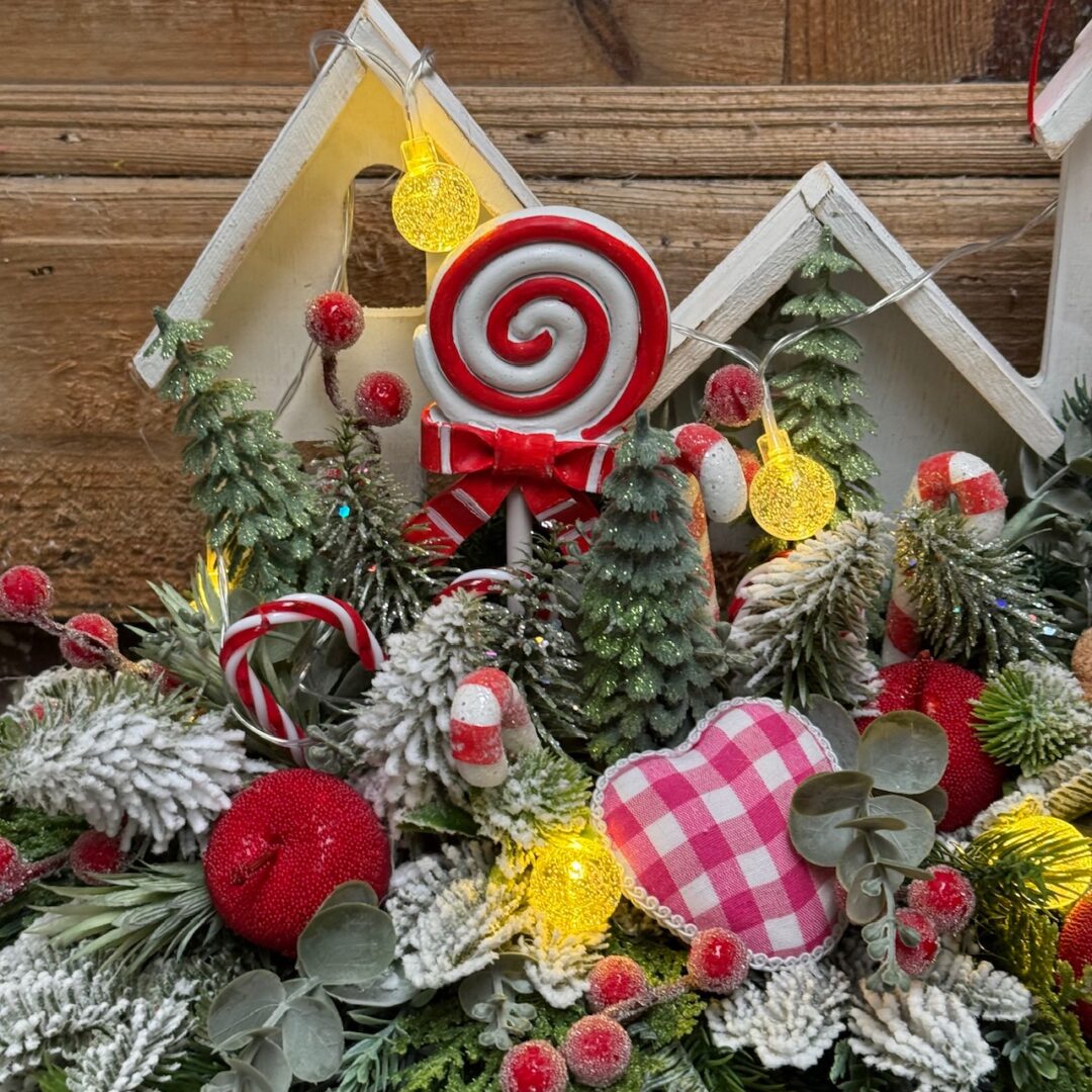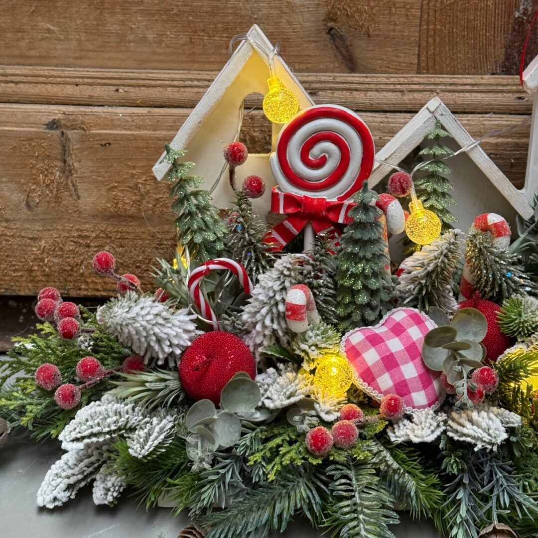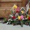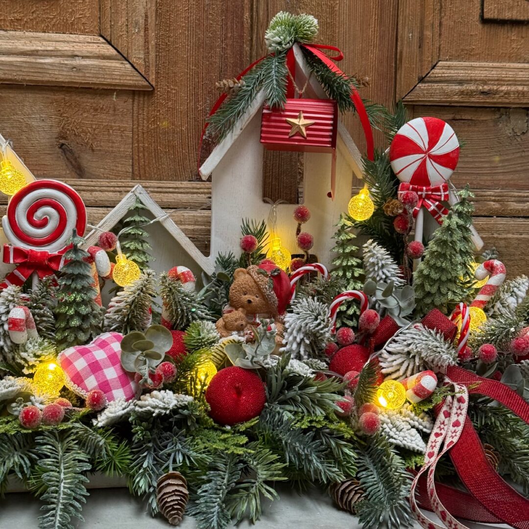 Kompozycja wykonany ze sztucznych świerkowych gałązek. Podstawa – drewniane domki.