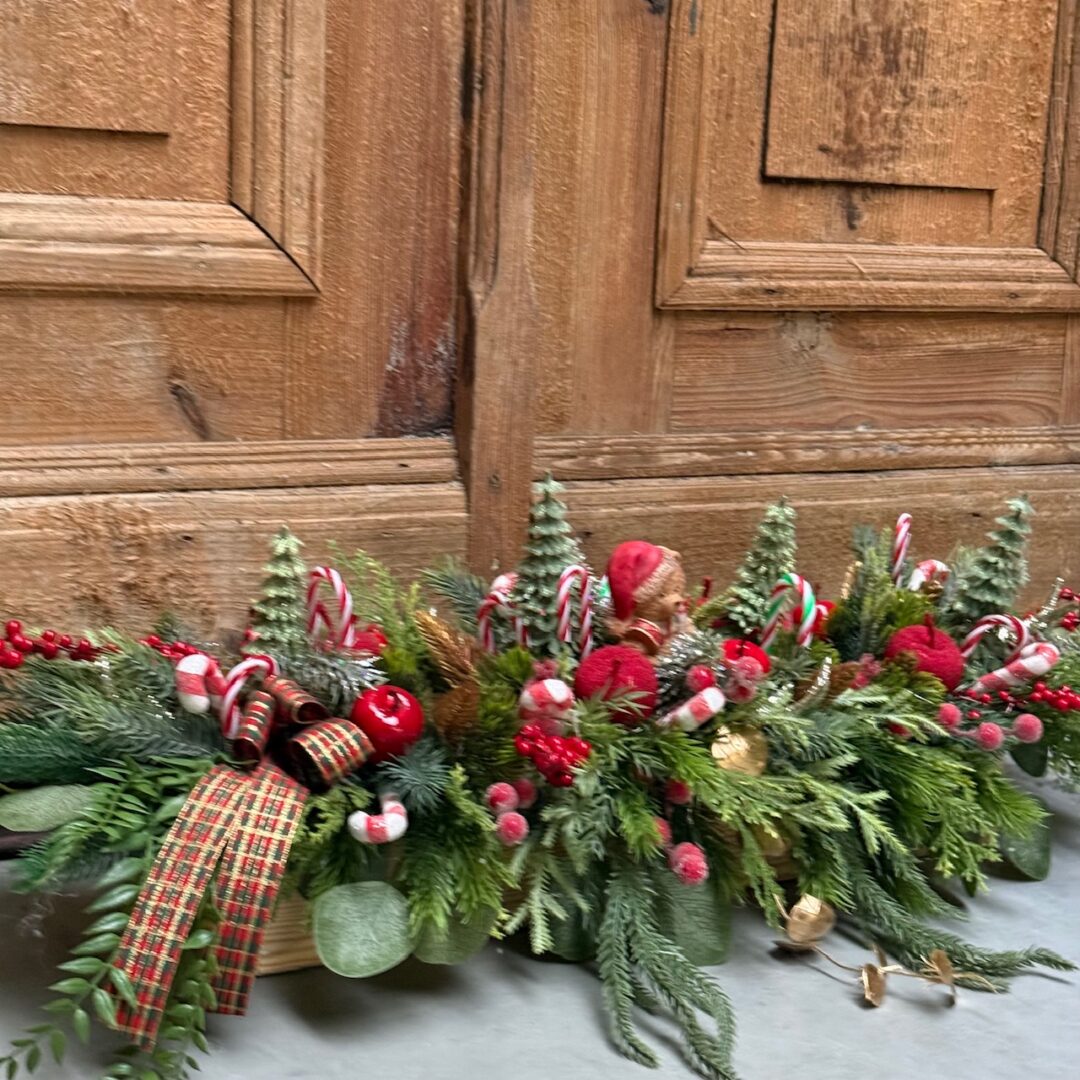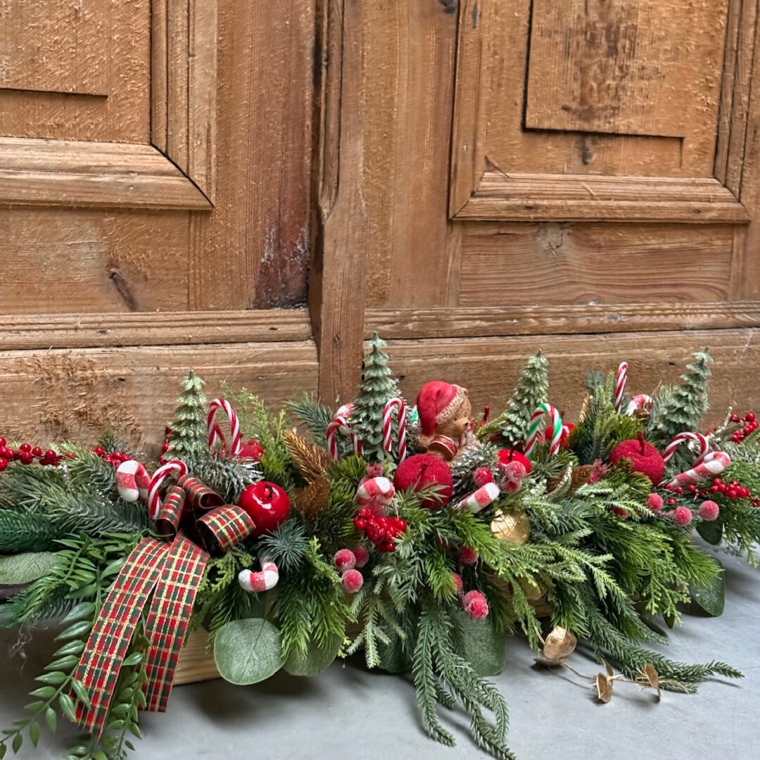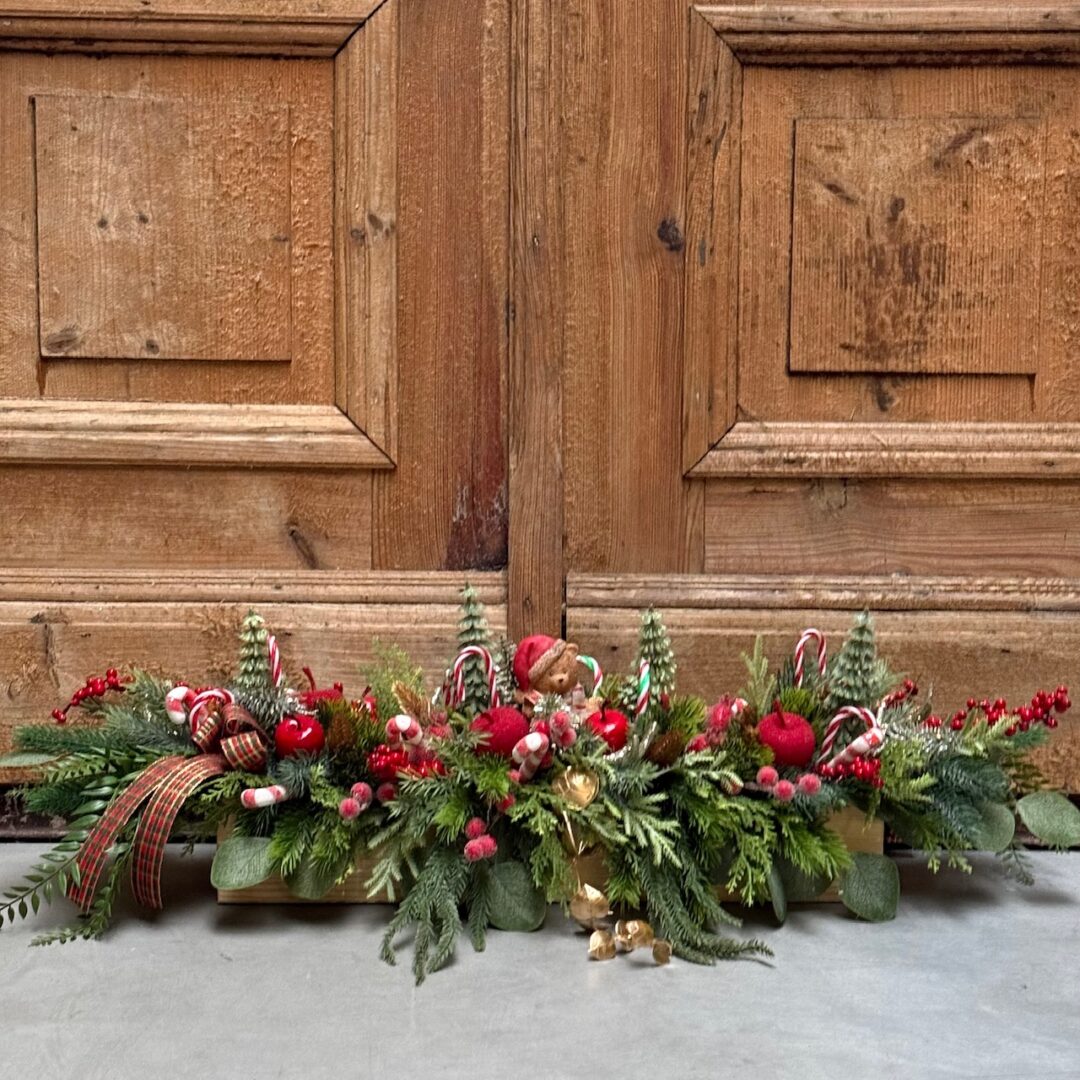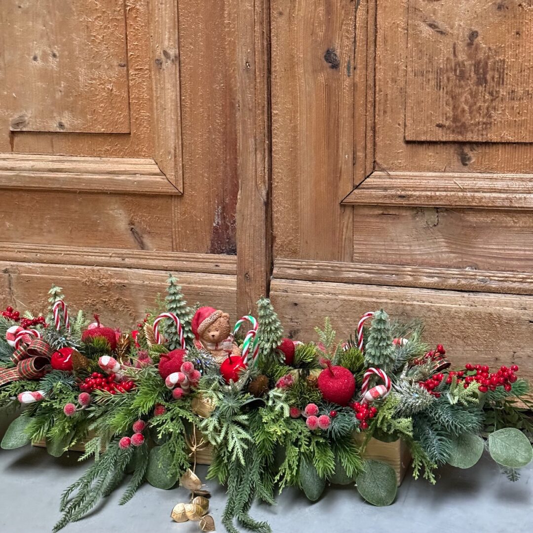 Kompozycja wykonany ze sztucznych świerkowych gałązek w naturalnym drewnianym pojemniku.