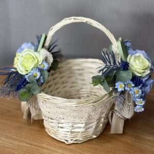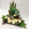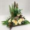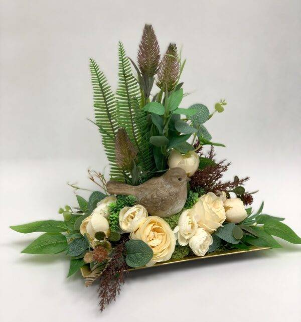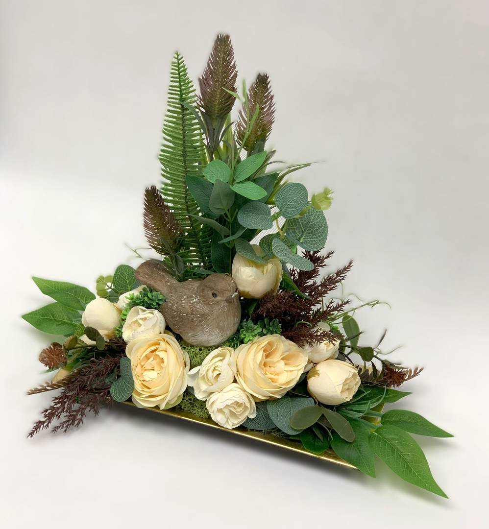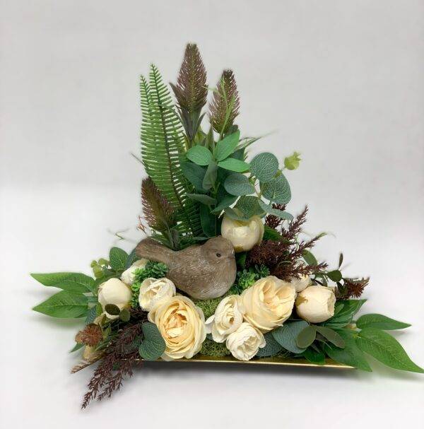 Dodatkowym elementem tej kompozycji jest ceramiczny ptaszek, który nadaje jej wyjątkowego uroku i delikatności. Kwiaty sztuczne w kolorze kremowym doskonale komponują się z naturalnymi odcieniami zieleni pozostałych dodatków, tworząc harmonijną i przyjemną dla oka kompozycję.