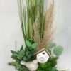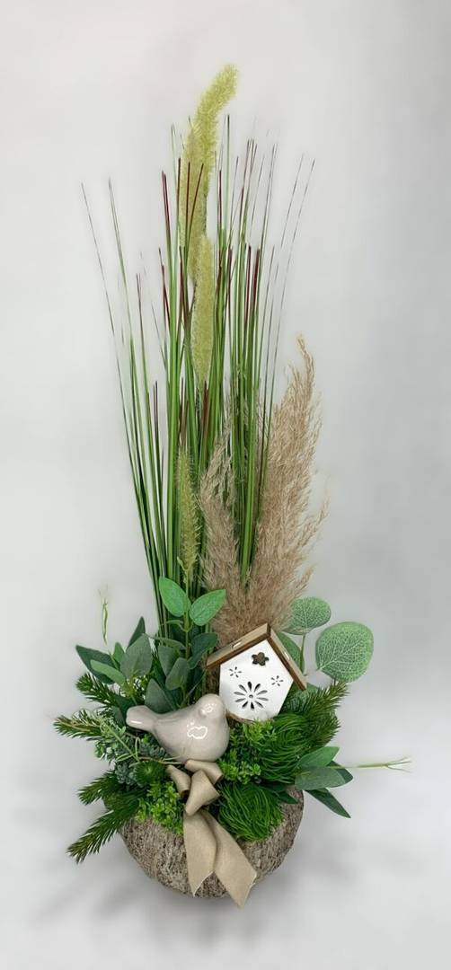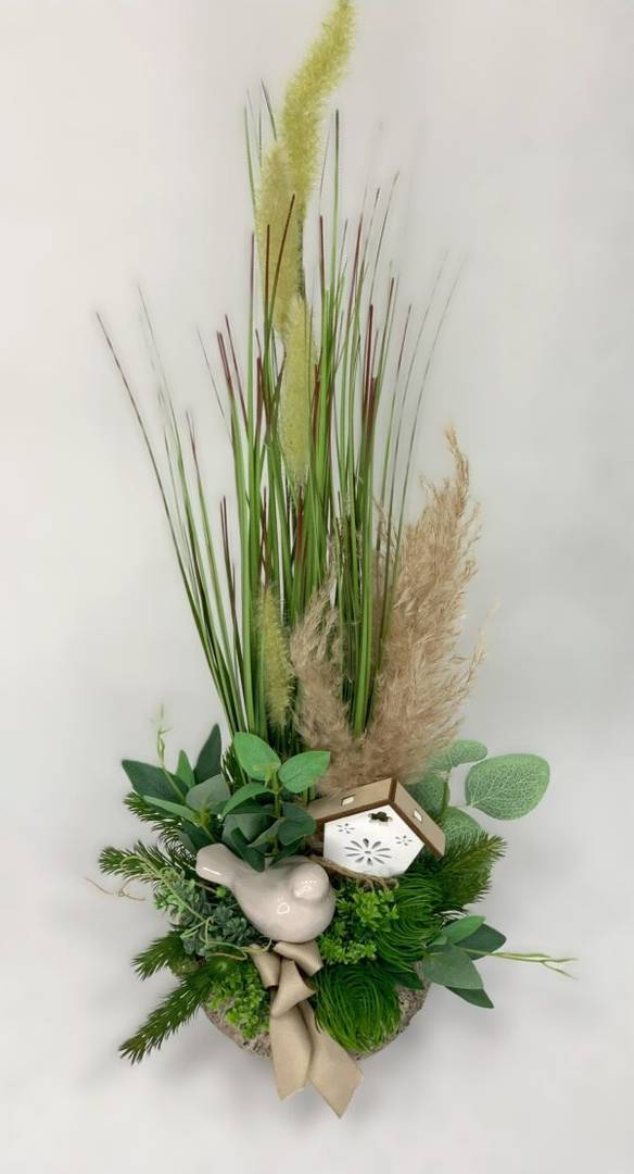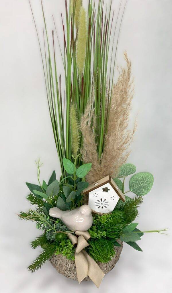 Kompozycja z trawą w donicy z domkiem i ptaszkiem