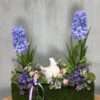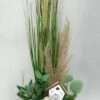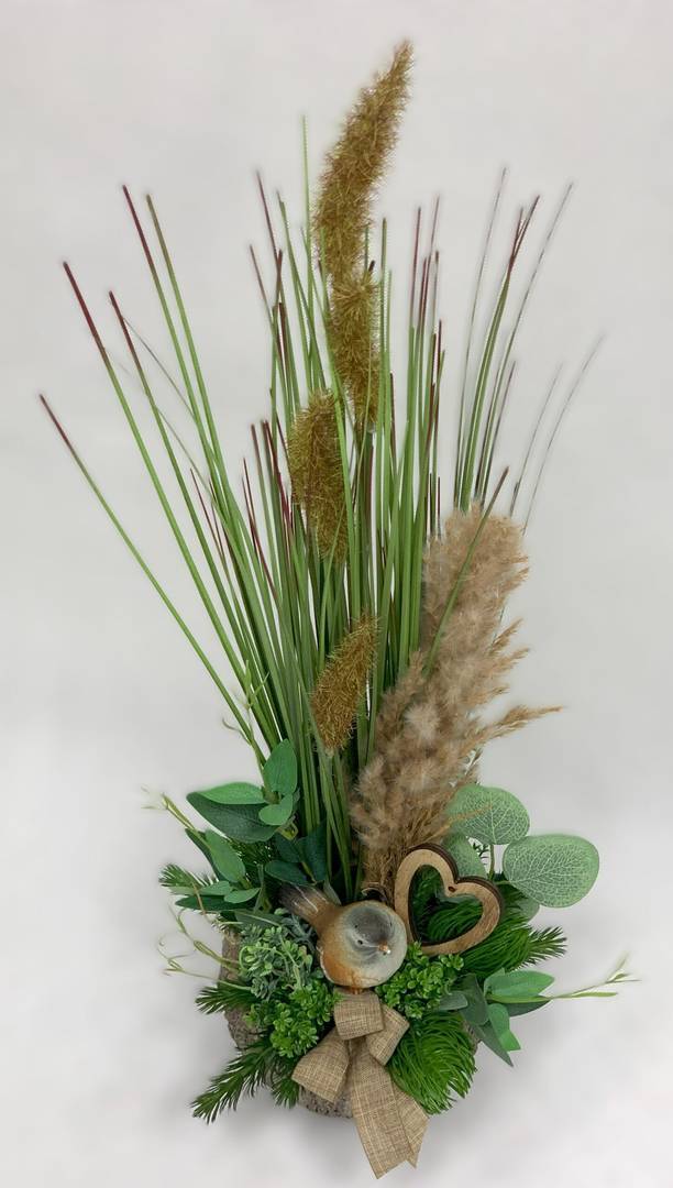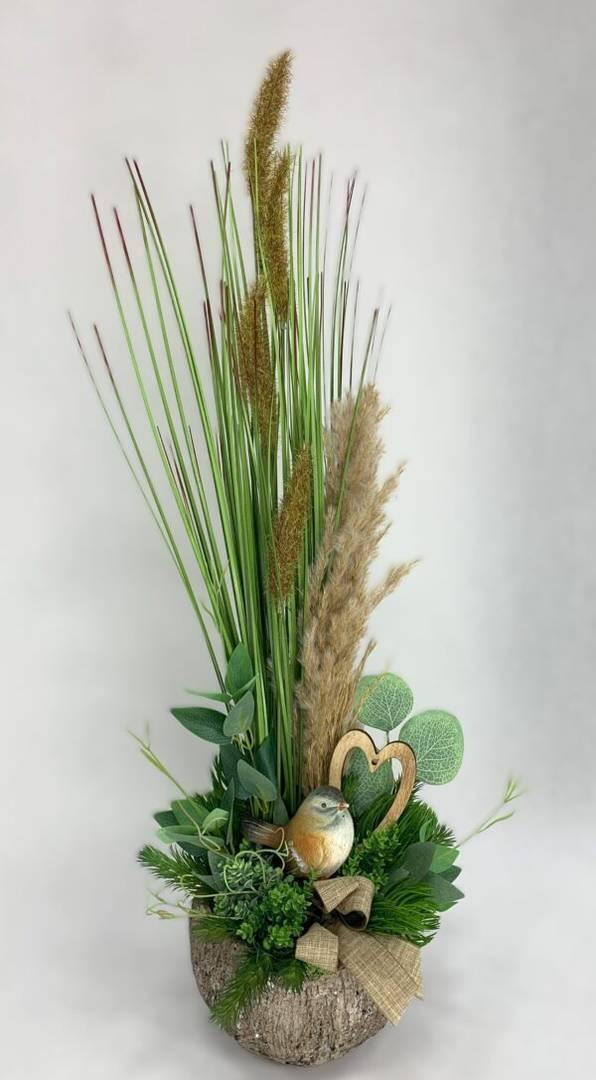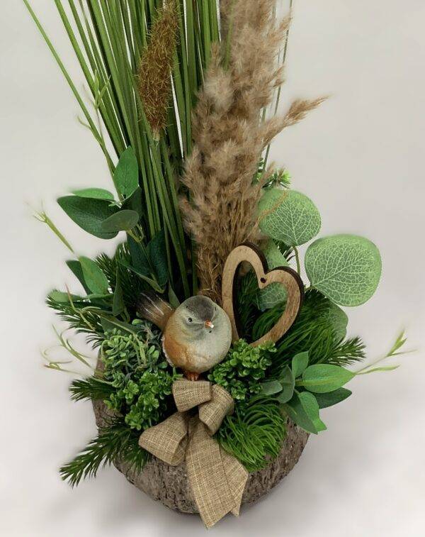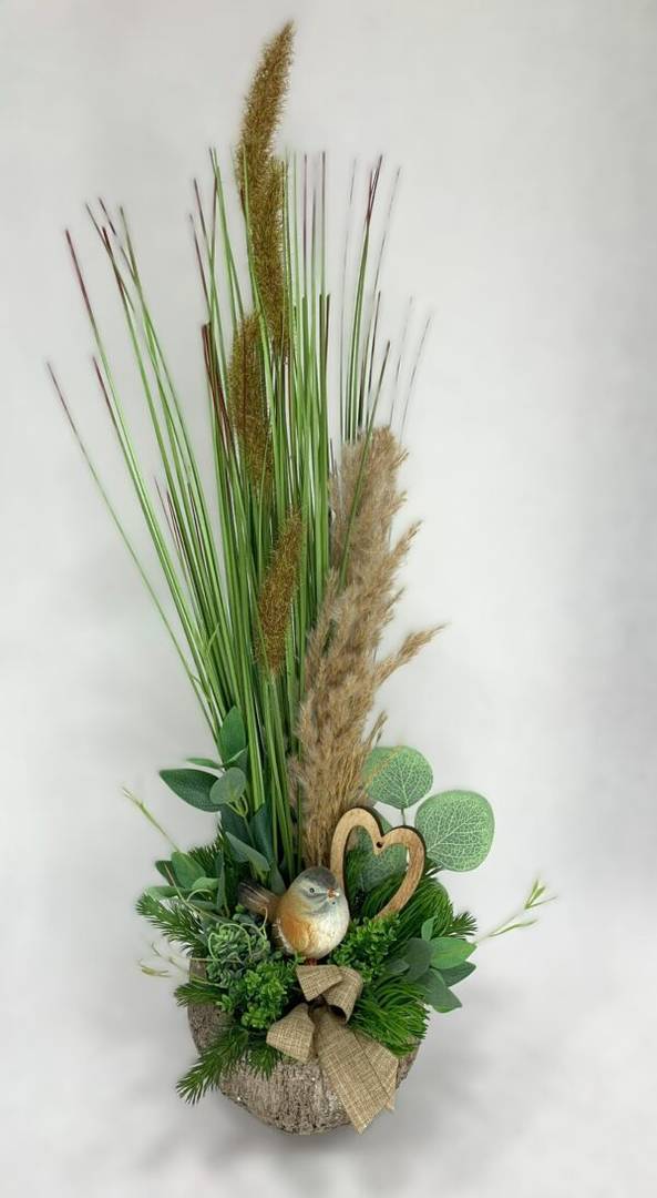 Kompozycja z trawą w donicy z ptaszkiem i serduszkiem