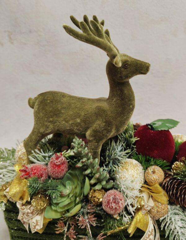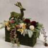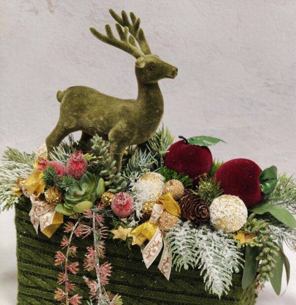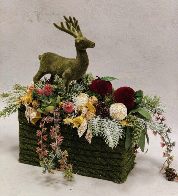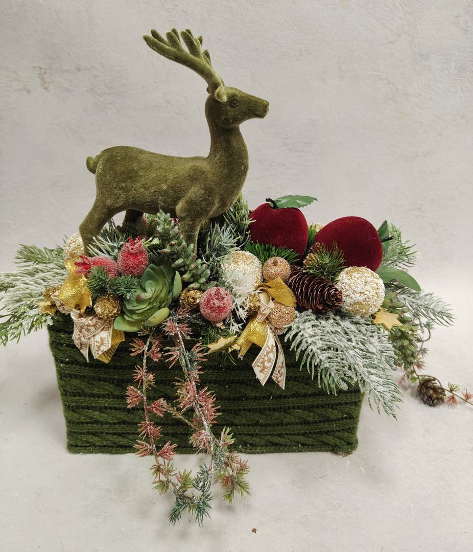 Kompozycja wykonana ze sztucznych świerkowych gałązek.