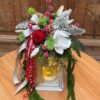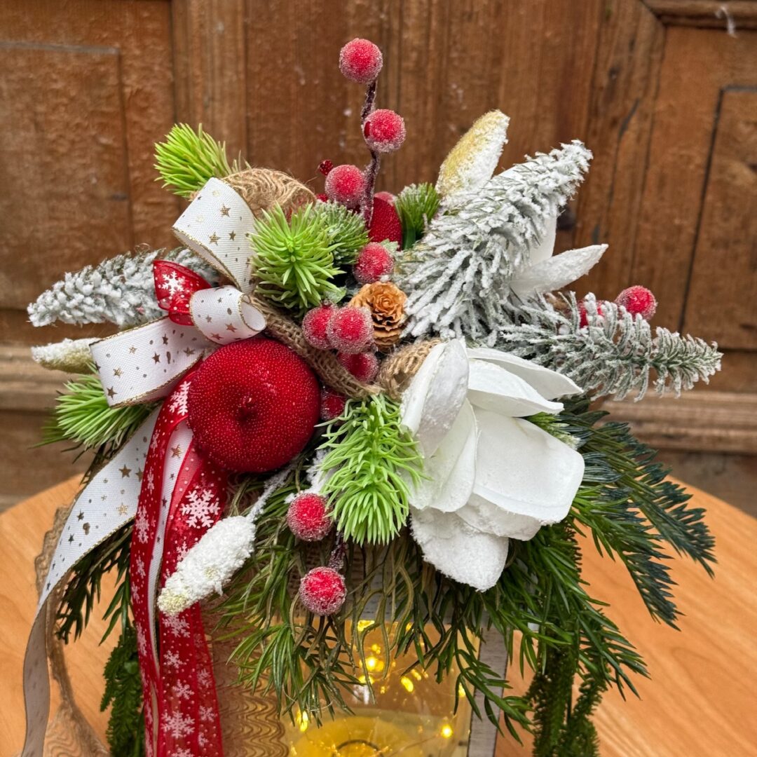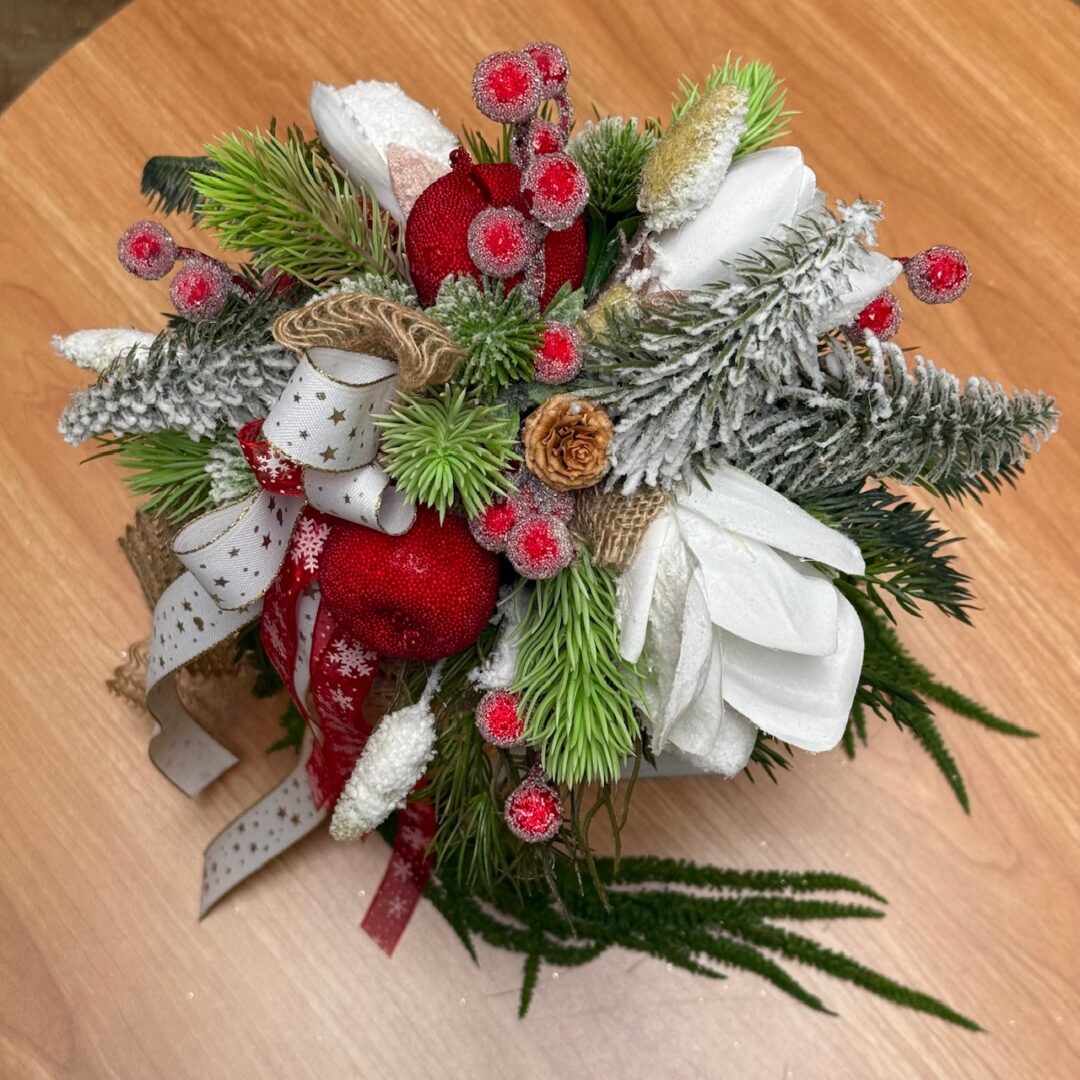 Kompozycja wykonana ze sztucznych świerkowych gałązek.