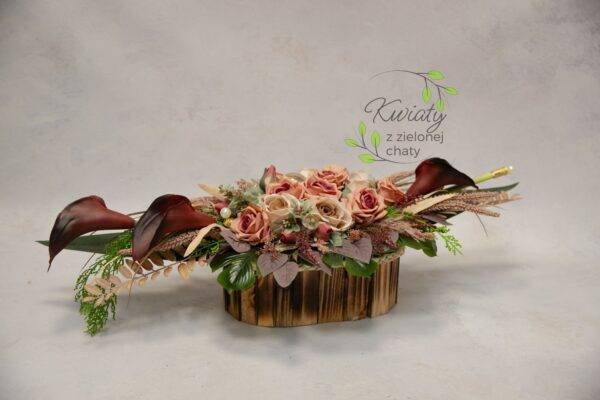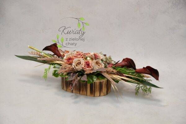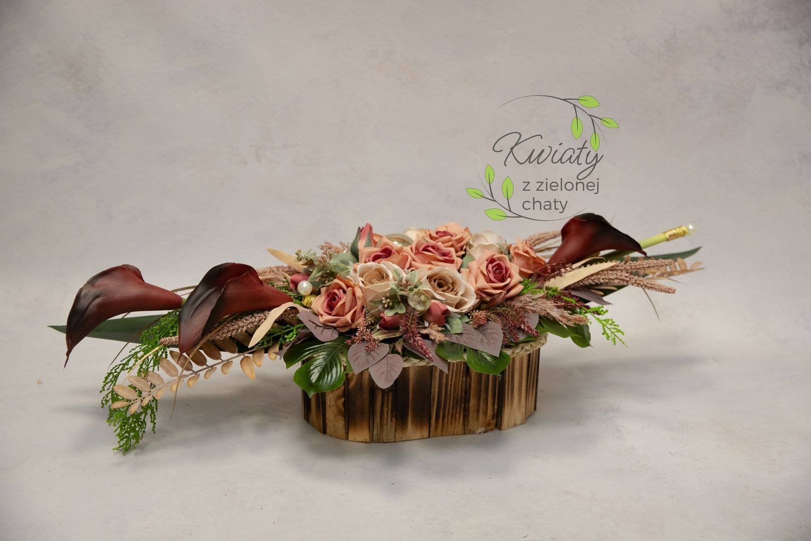 Stroik do położenia na grób w drewnianym pojemniku z kaliami, różami i złotą kulą..