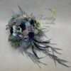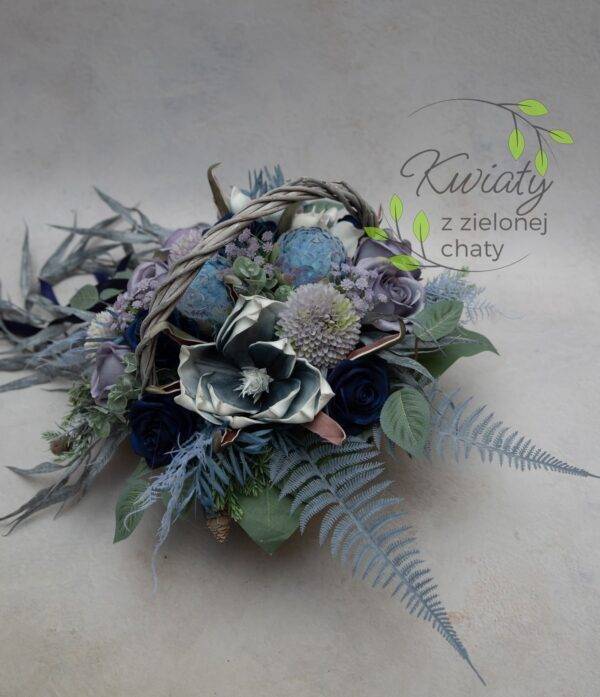 Kompozycja do położenia na grób z kwiatami w kolorach niebieskich.
