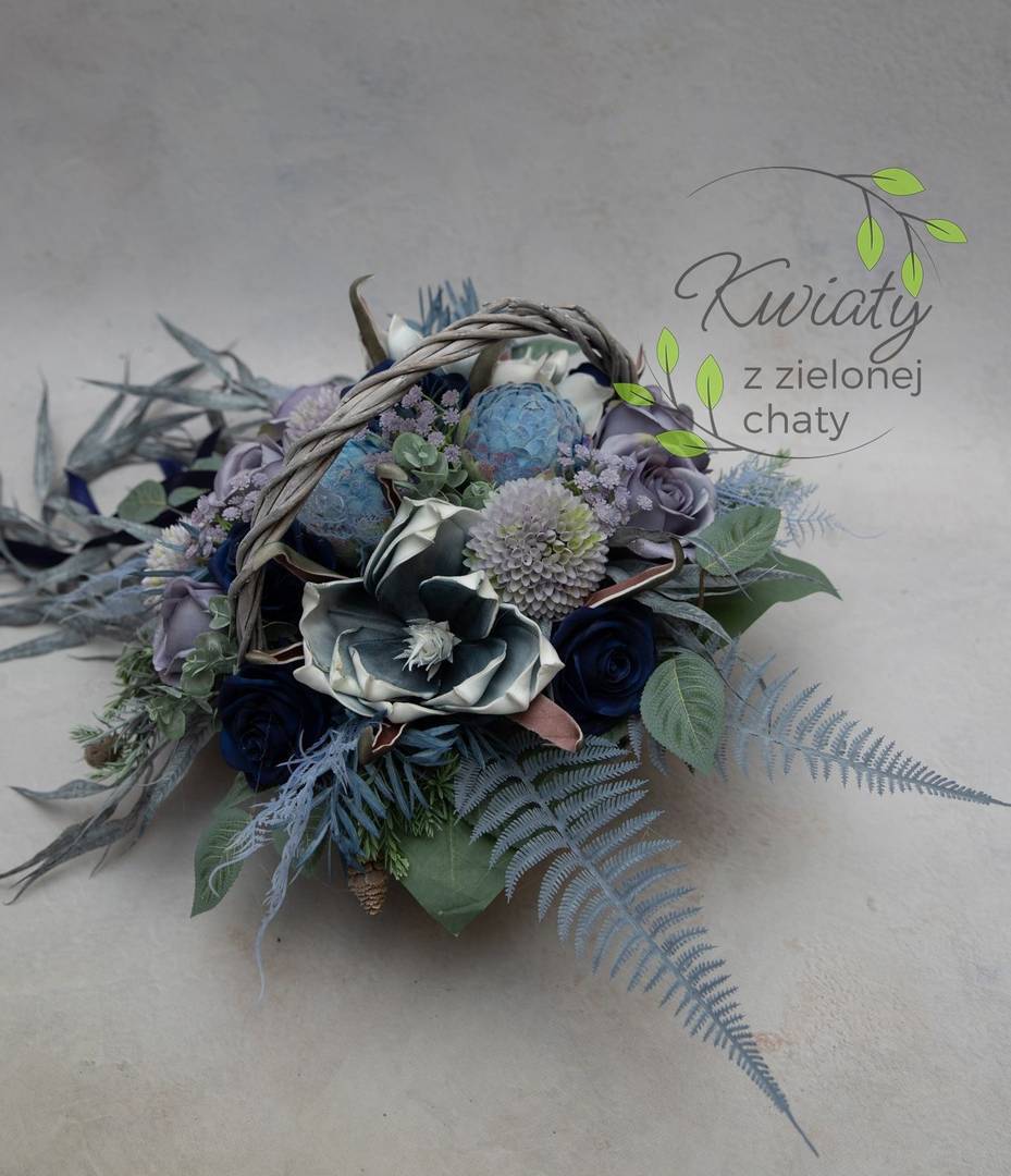 Dekoracja do położenia na grób w wiklinowym koszu o średnicy około 43 cm i z wystającymi elementami o długości około 47 cm.