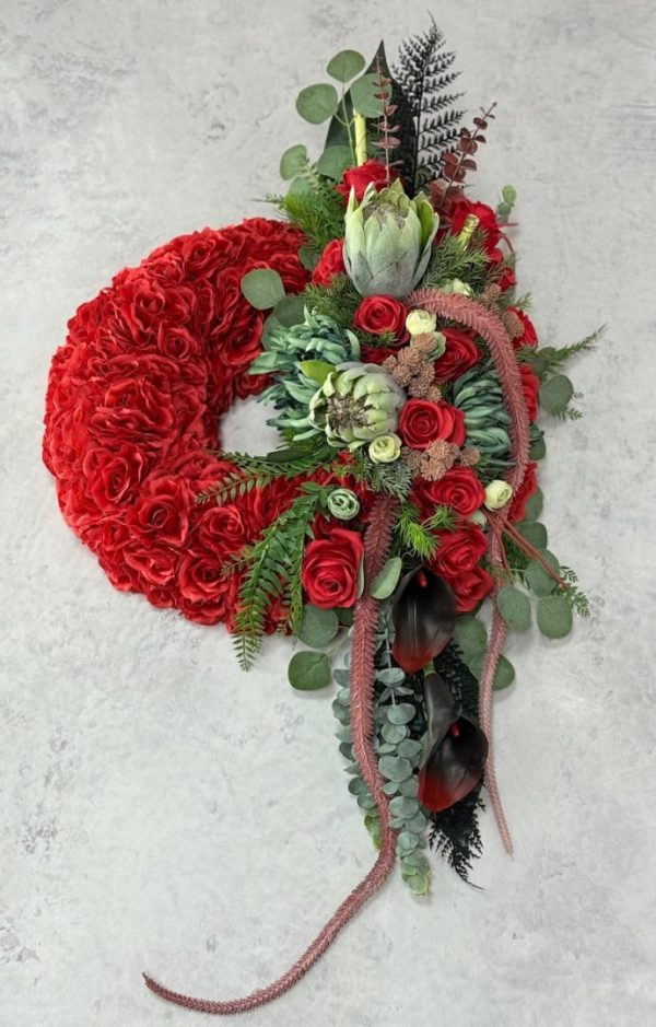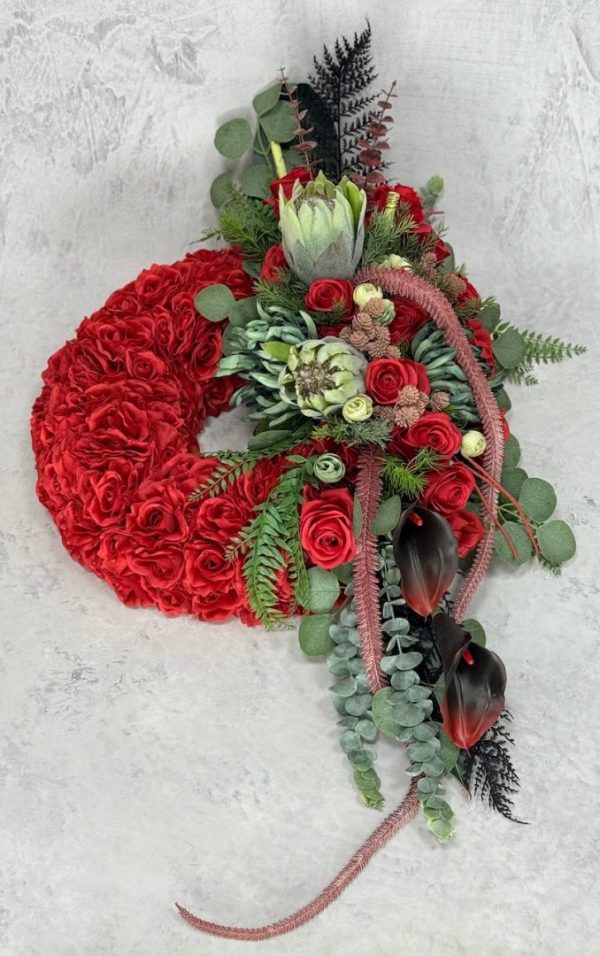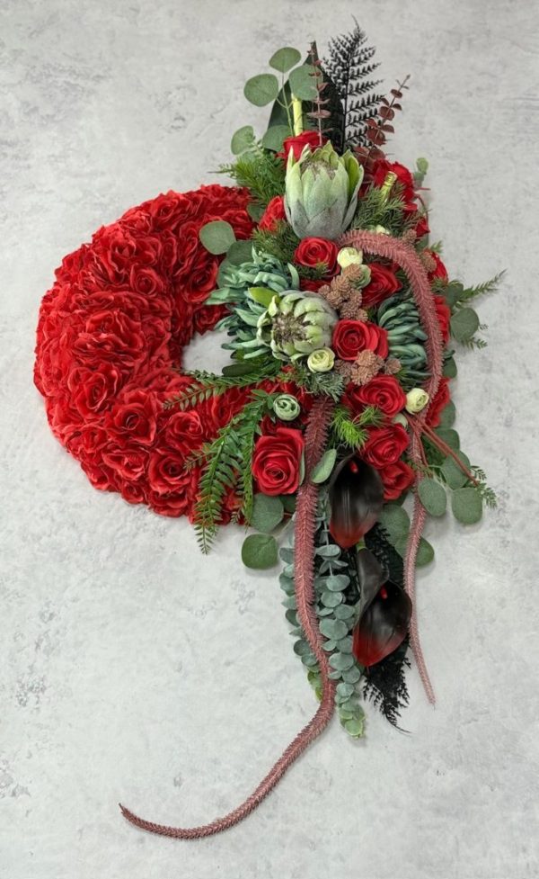 Dekoracja do położenia wykonana na słomianym wianku o długość około 100 cm, szerokość około 60 cm.
