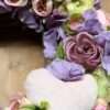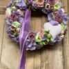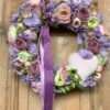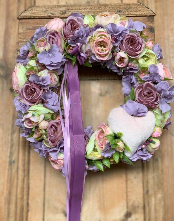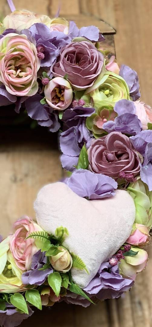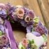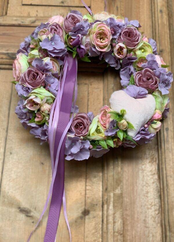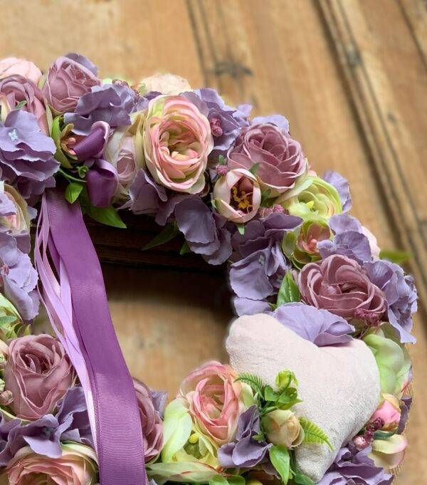 Wianek do powieszenia z sztucznych kwiatów w kolorach brudnego różu i fioletu, z dodatkiem zielonego i jasnego różu, jest wyjątkową ozdobą, która nadaje elegancji i uroku każdemu wnętrzu. Kompozycja wzbogacona jest o welurowe serce i wstążki, które dodają mu wyjątkowego charakteru i stylu.