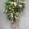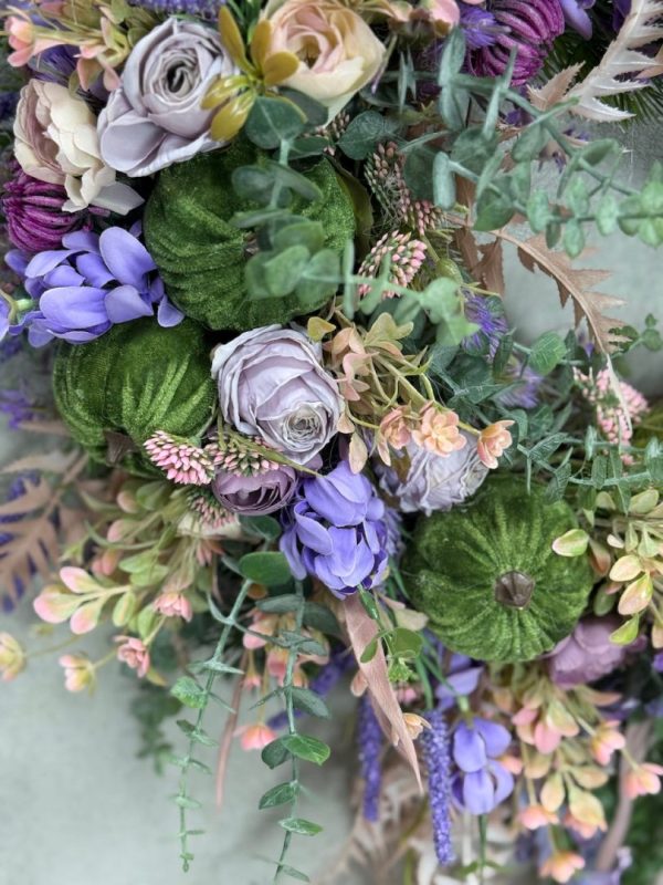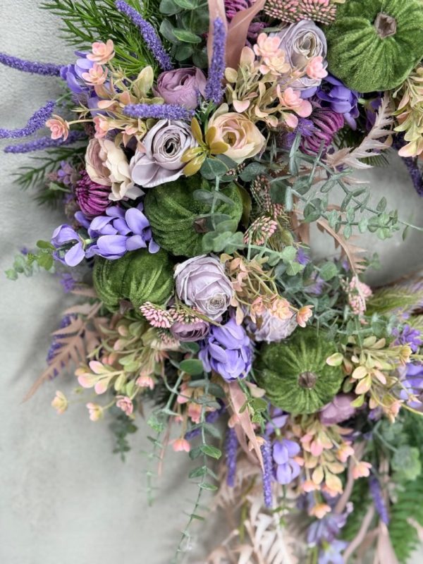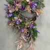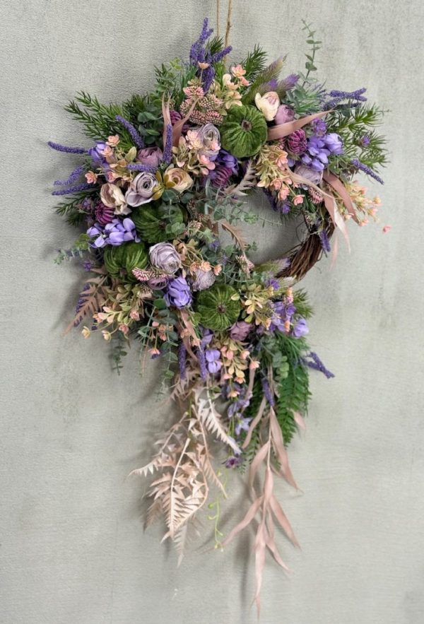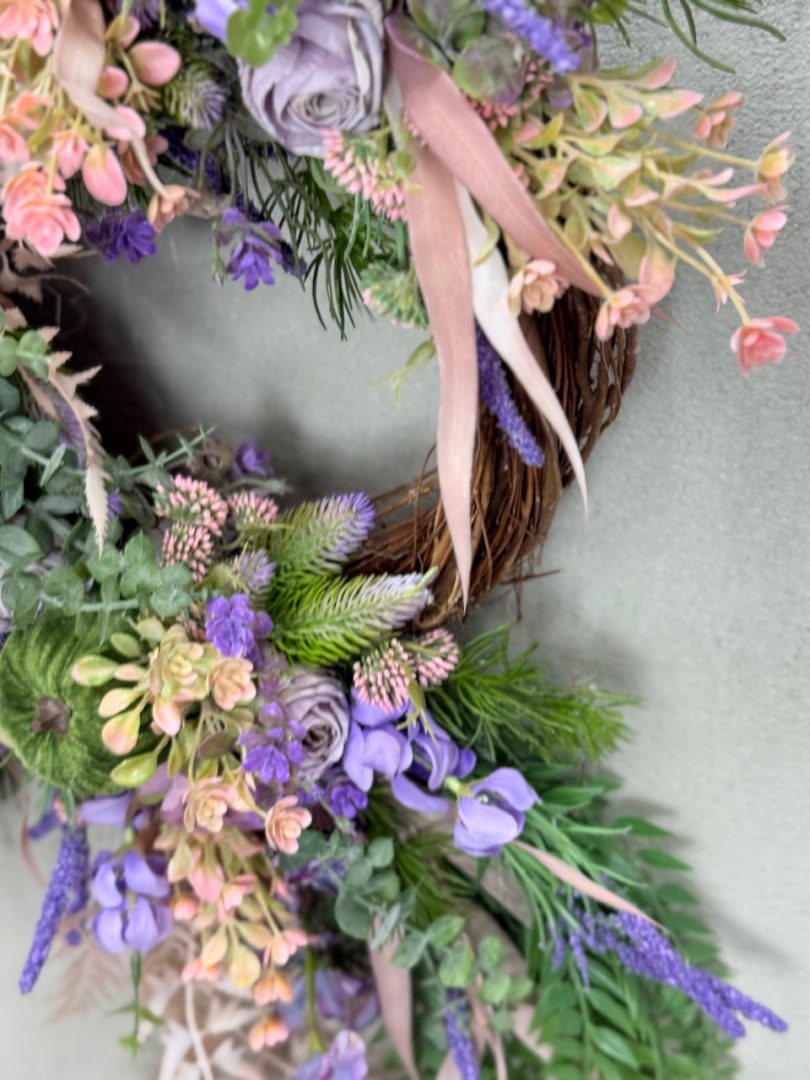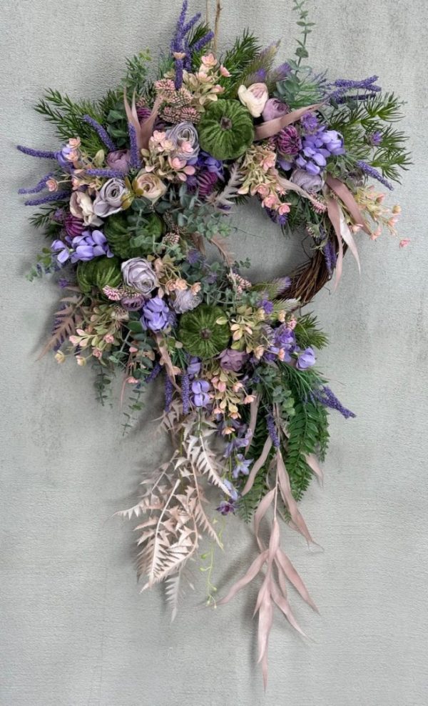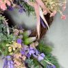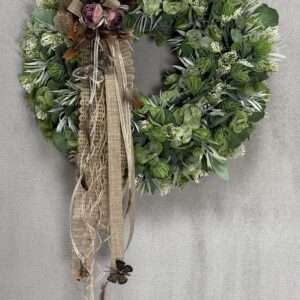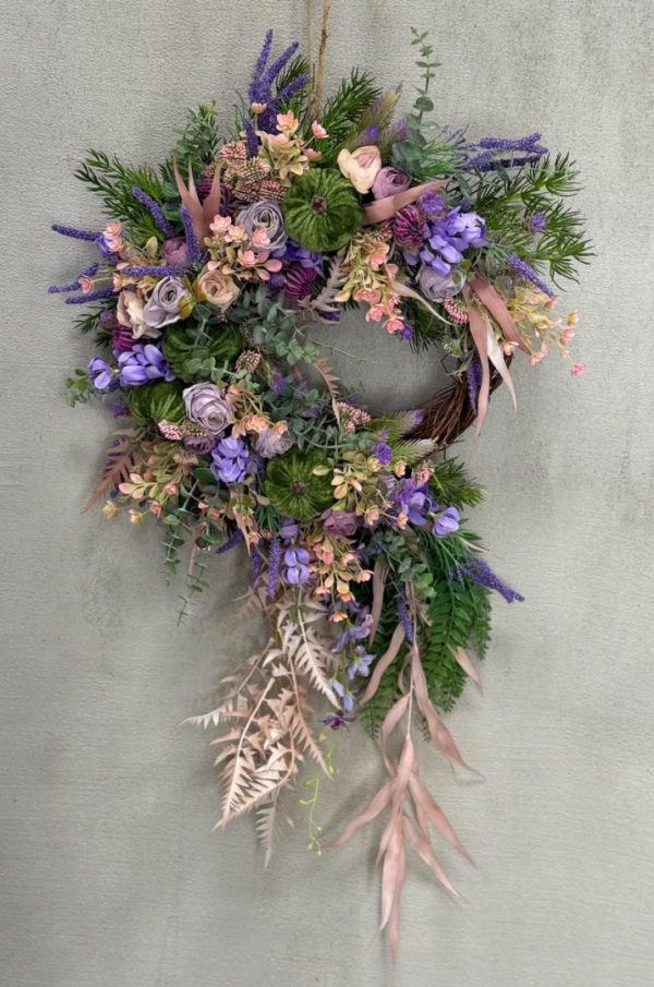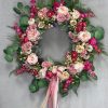 Wianek wykonany w całości ze sztucznych kwiatów i dodatków.